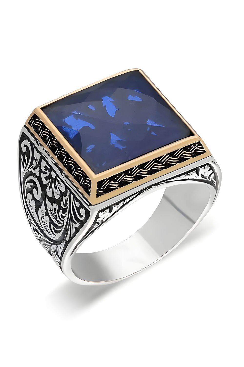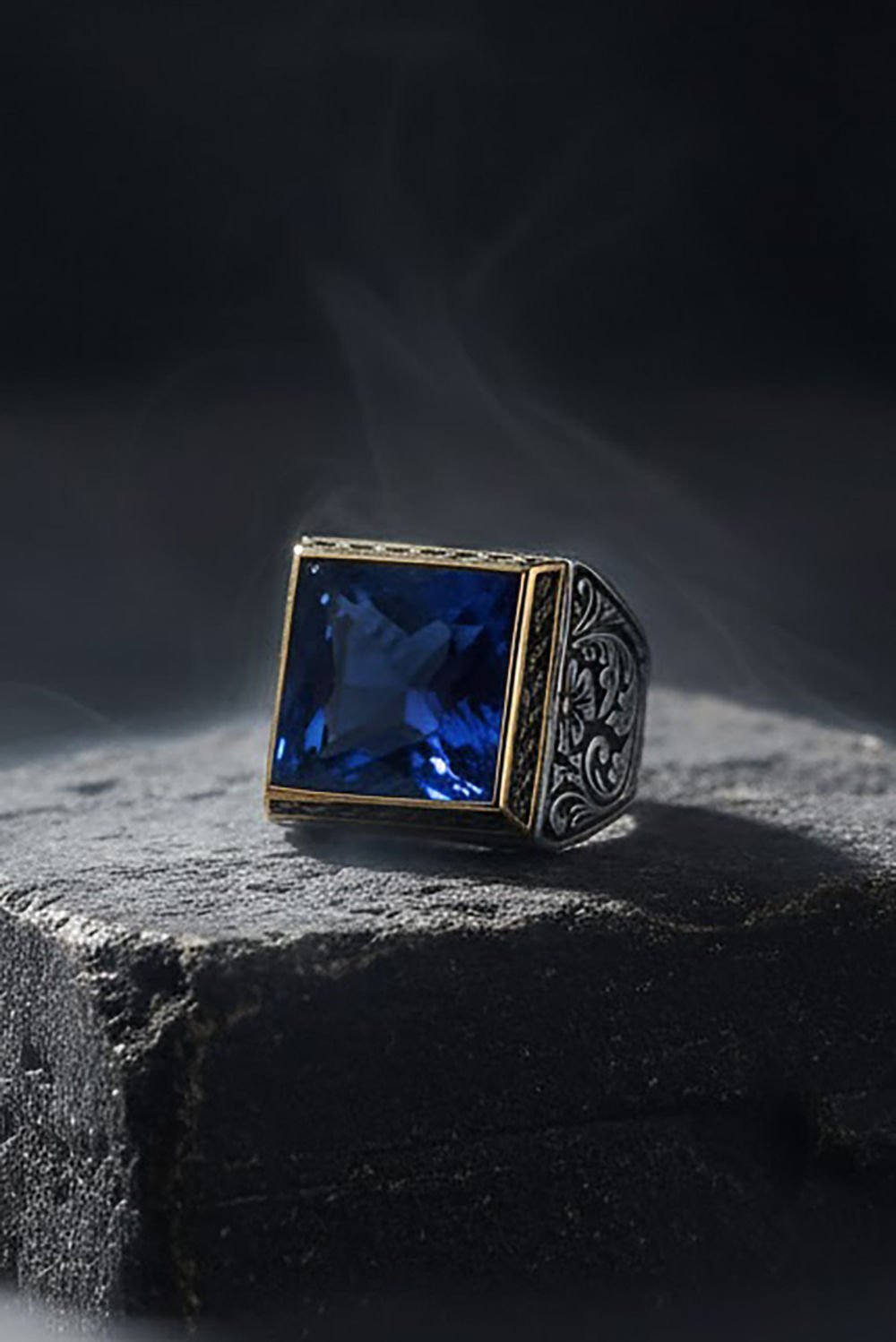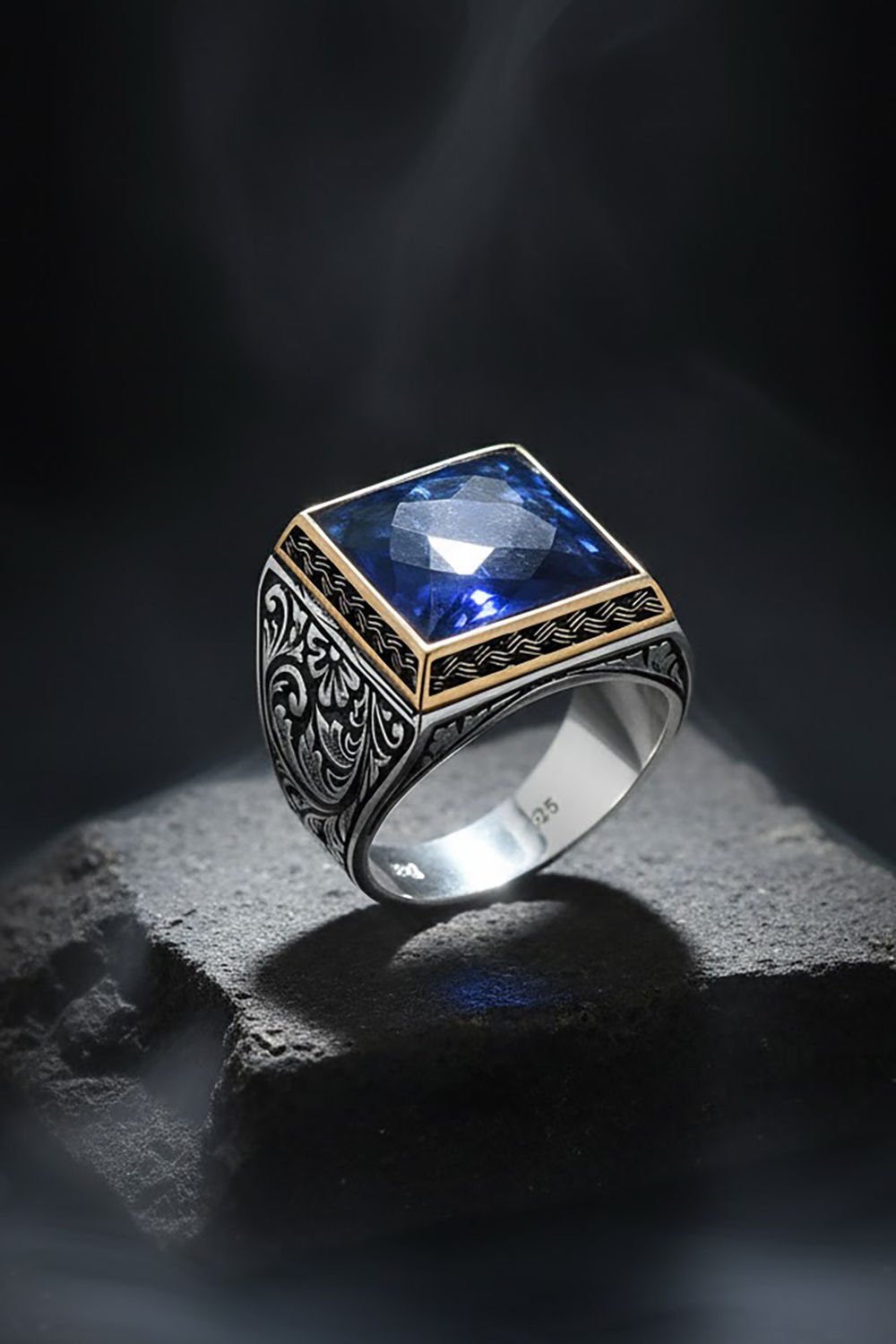 Kare Model Kalem İşlemeli Mavi Zirkon Taşlı Yüzük