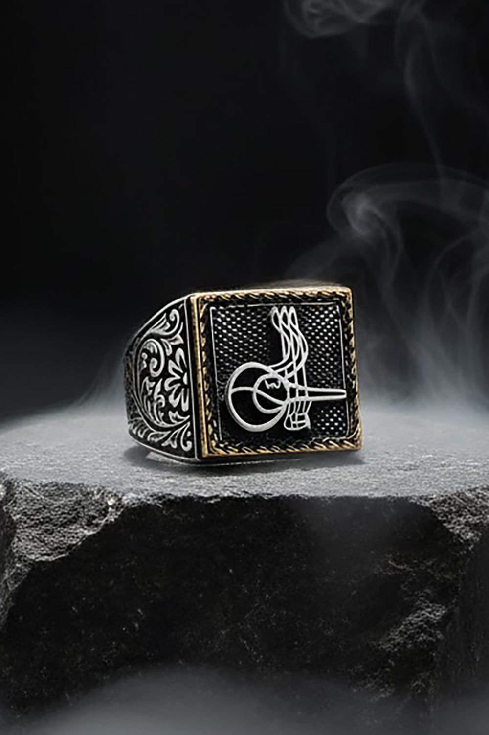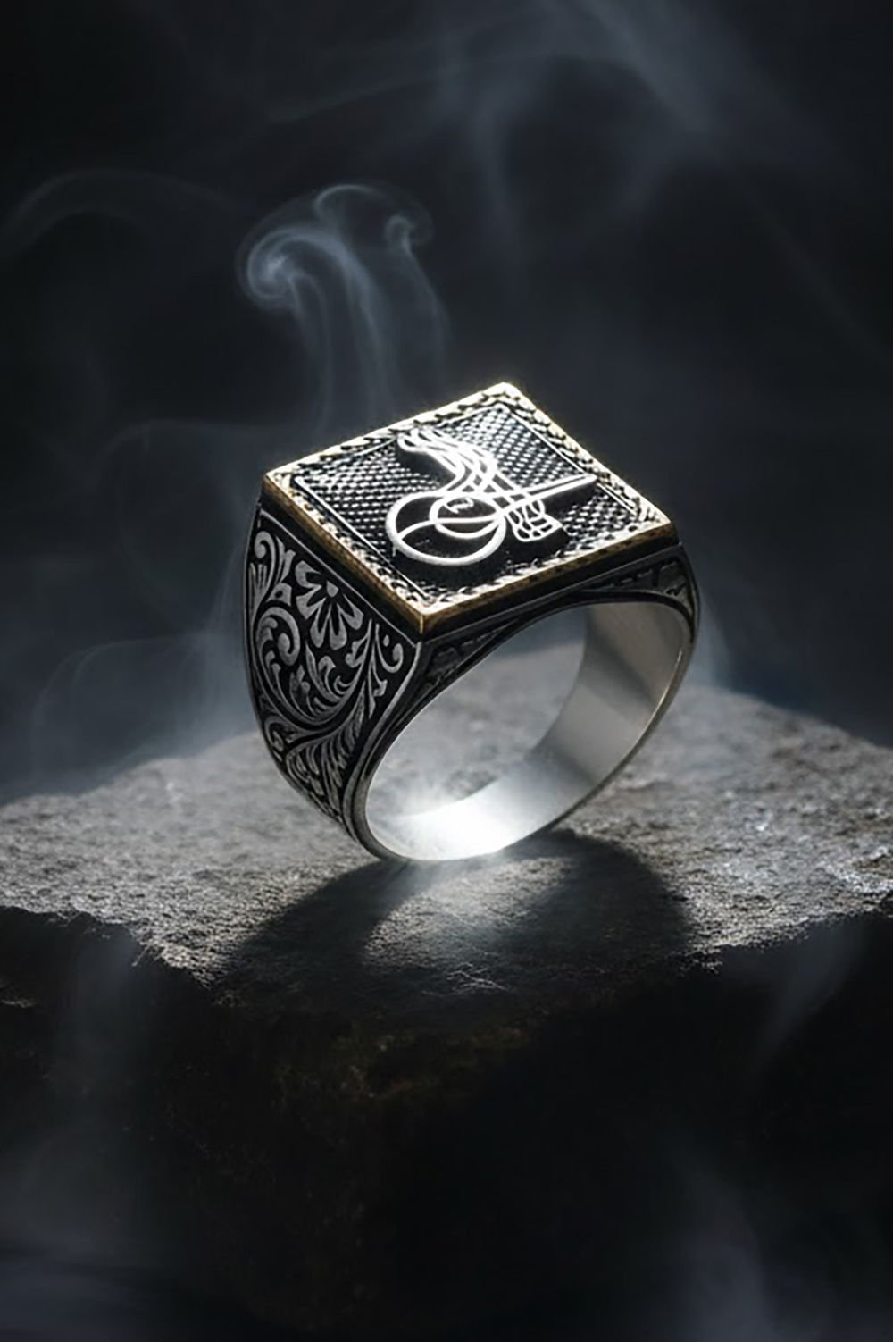 Kare Model Kalem İşlemeli Tuğra Desenli Yüzük