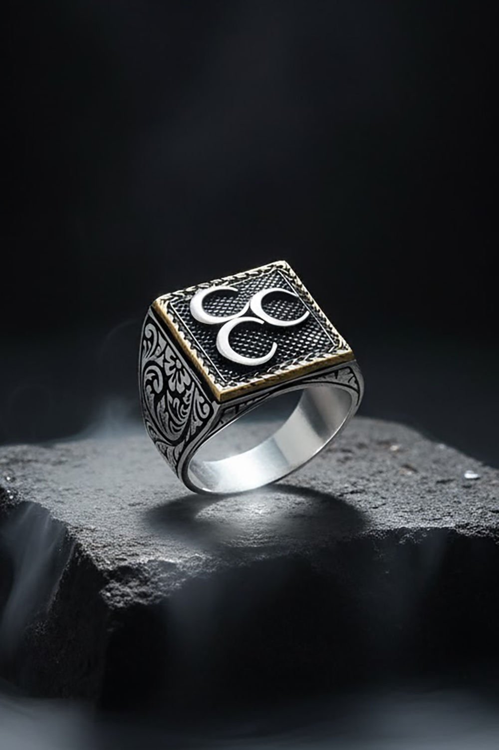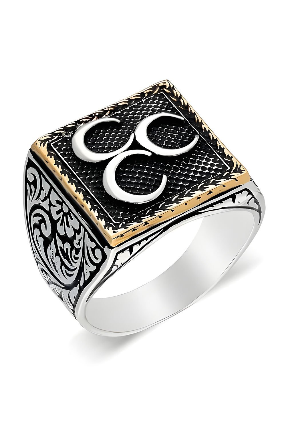 Kare Model Kalem İşlemeli Üç Hilal Desenli Yüzük |