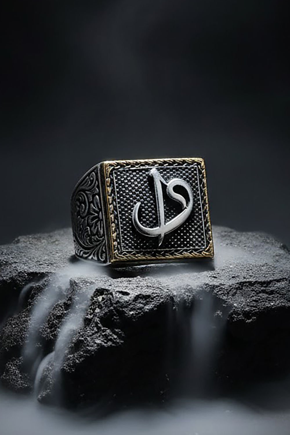 Kare Model Kalem İşlemeli Vav Elif Desenli Yüzük |