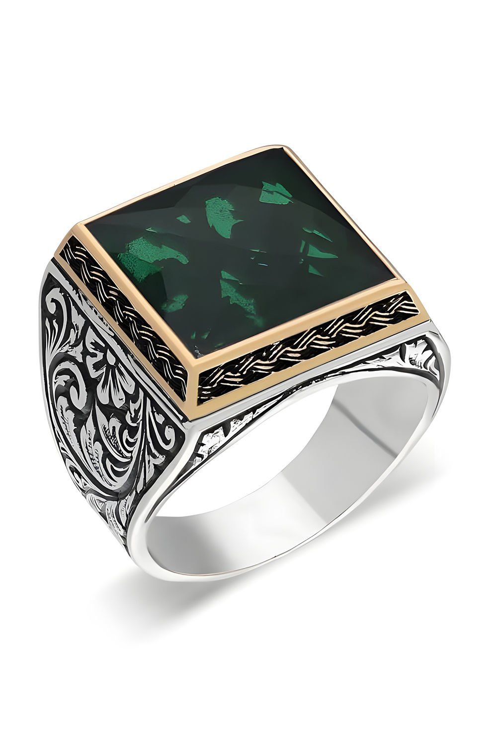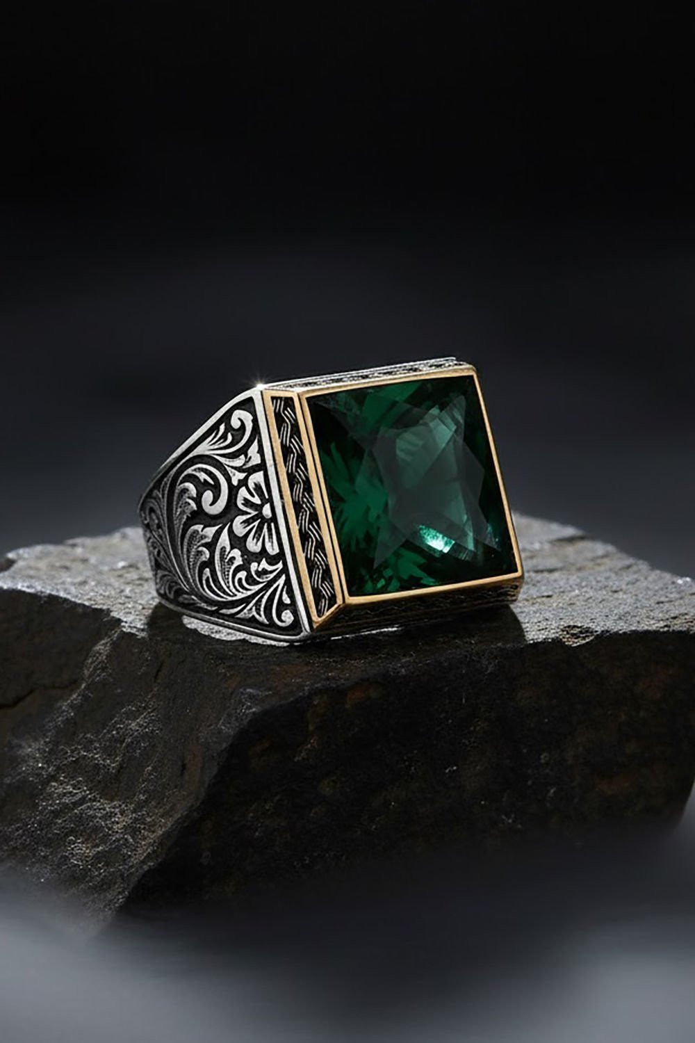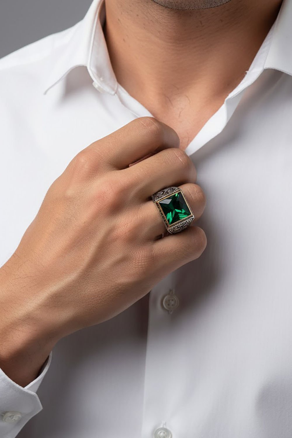 Doğal Yeşil Zirkon Taşlı Kare Model El İşçiliği Erkek Yüzük