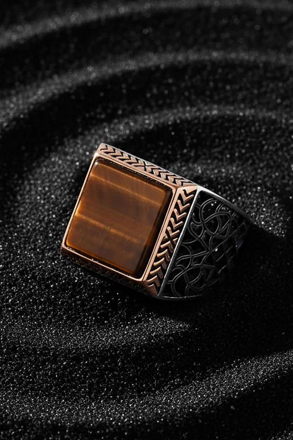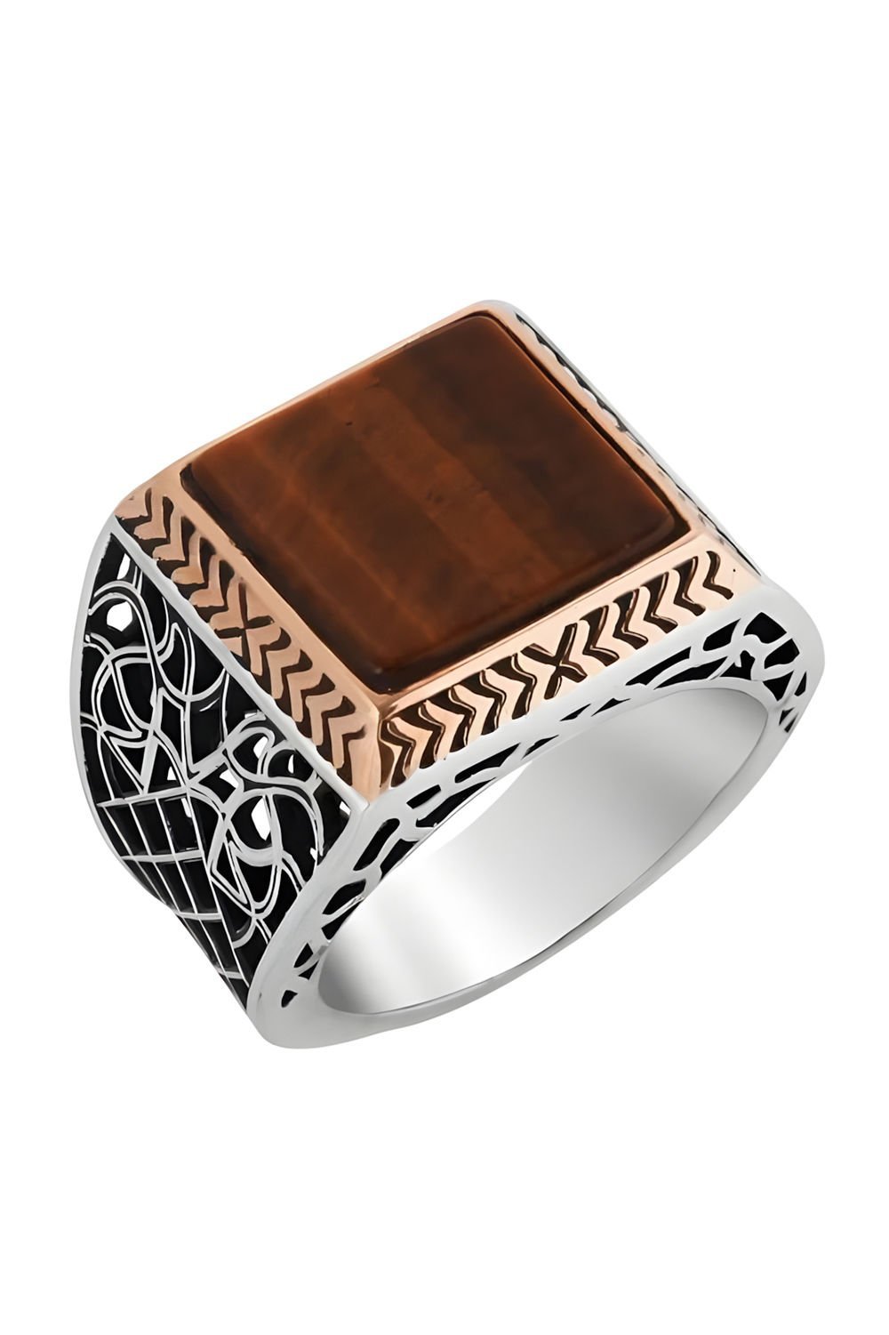 Bu özel erkek yüzüğü, doğal kaplangözü taşı ve 925 ayar gümüş ile ustaca işlenmiştir. Kare modeli ve özel işçiliği ile dikkat çeker.
