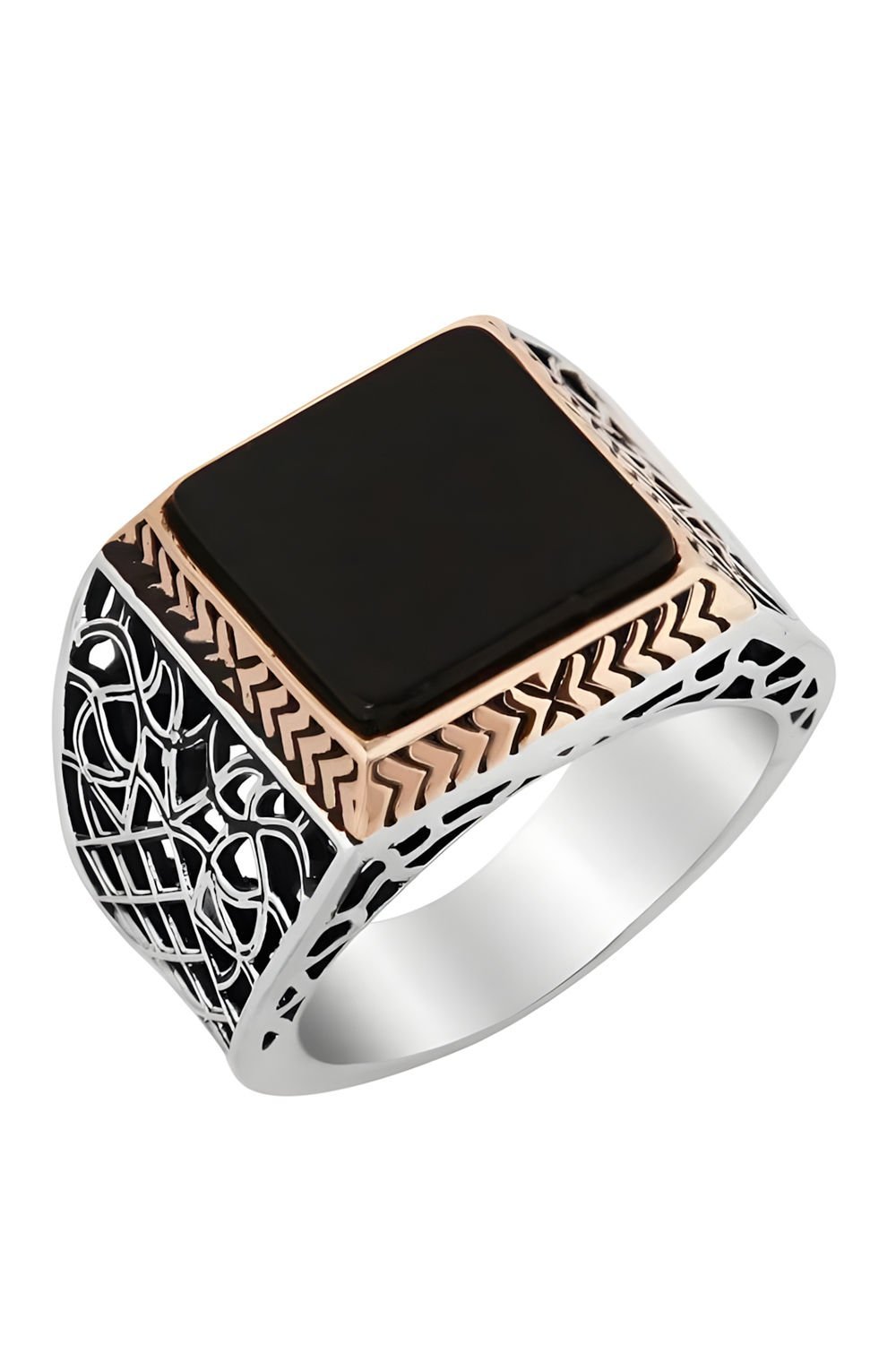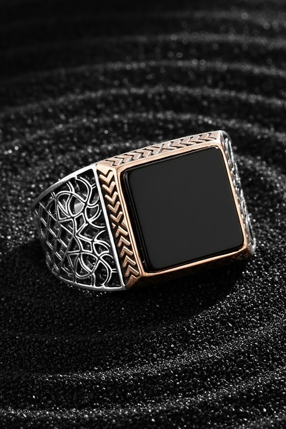 Bu özel erkek yüzüğü, doğal oniks taşı ve 925 ayar gümüş ile ustaca işlenmiştir. Kare modeli ve özel işçiliği ile dikkat çeker.