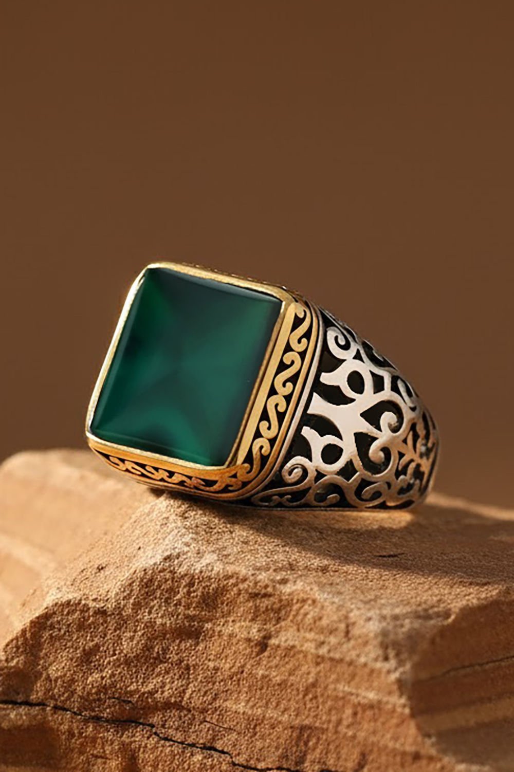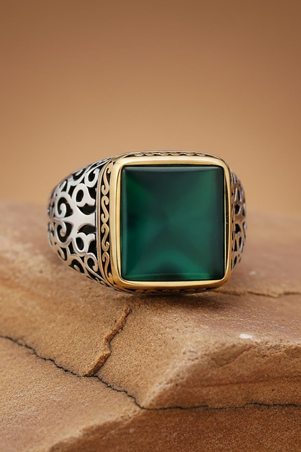 Kare Model Yeşil Akik Taşlı Gümüş Erkek Yüzük |