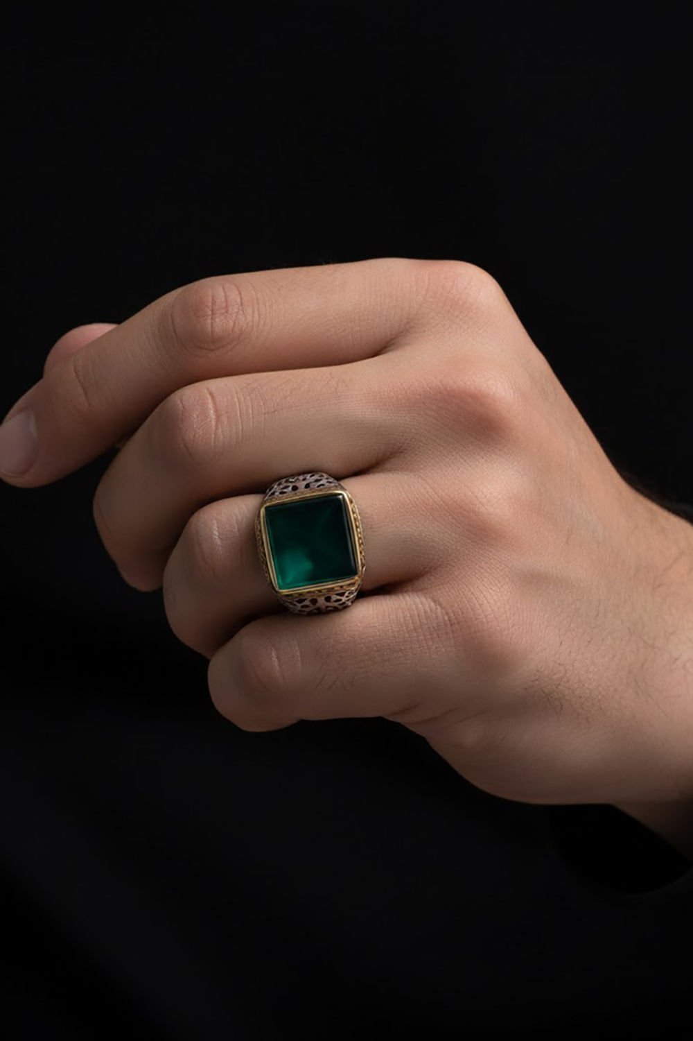 Bu özel erkek yüzüğü, doğal yeşil akik taşı ve el işçiliği ile 925 ayar gümüşten üretilmiştir. Kare modeli ve özel işçilik detaylarıyla dikkat çeken bu yüzük, zarif bir tarzı temsil ediyor.