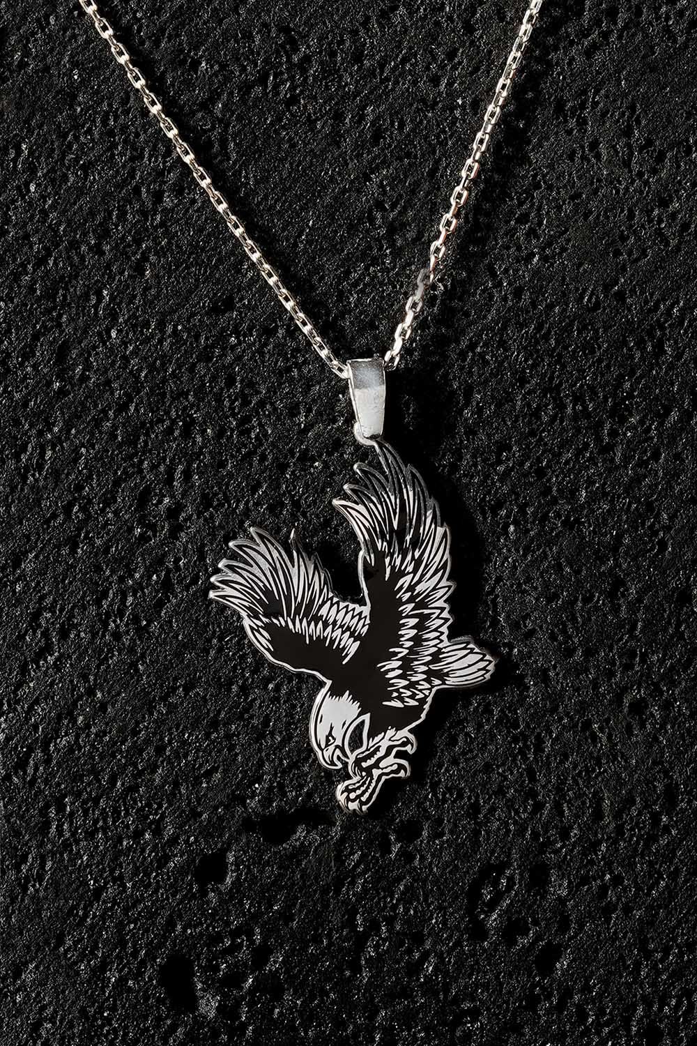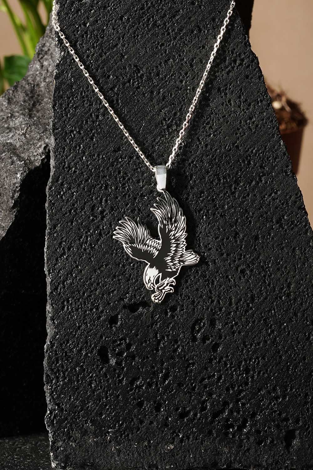 Bu kolye, uçan kartal figürü ile gücü ve özgürlüğü temsil ederken, siyah mineli detaylar da modern tarzınızı ve karakterinizi yansıtır. Gümüşün dayanıklılığı ve doğal parlaklığı ile uzun süre kullanılabilir.