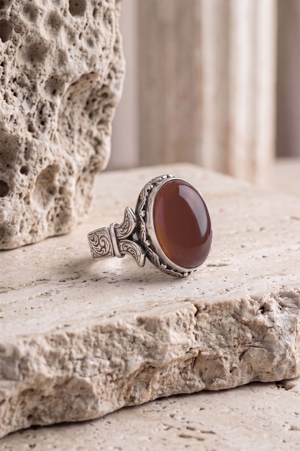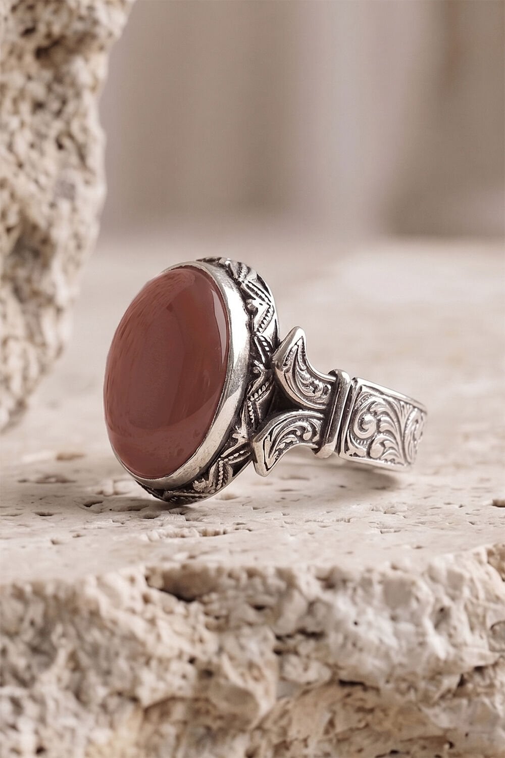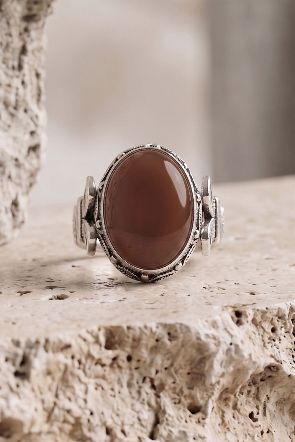 Yüzüğün kalbinde yer alan 13 x 18 mm ölçülerindeki oval akik taşı, doğal dokusu ve sıcak renk tonlarıyla karakterinizi yansıtır. Akik taşının yüzyıllardır bilinen huzur verici enerjisi, 925 ayar gümüşün asaletiyle birleşerek günlük kullanımda vazgeçilmez bir tamamlayıcıya dönüşür.