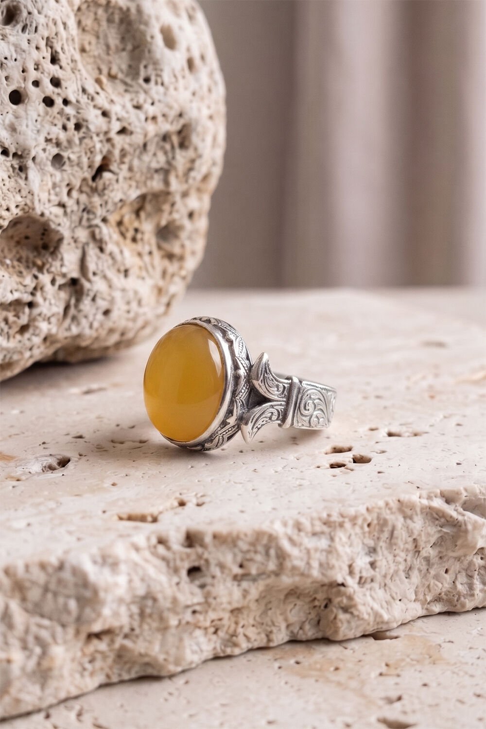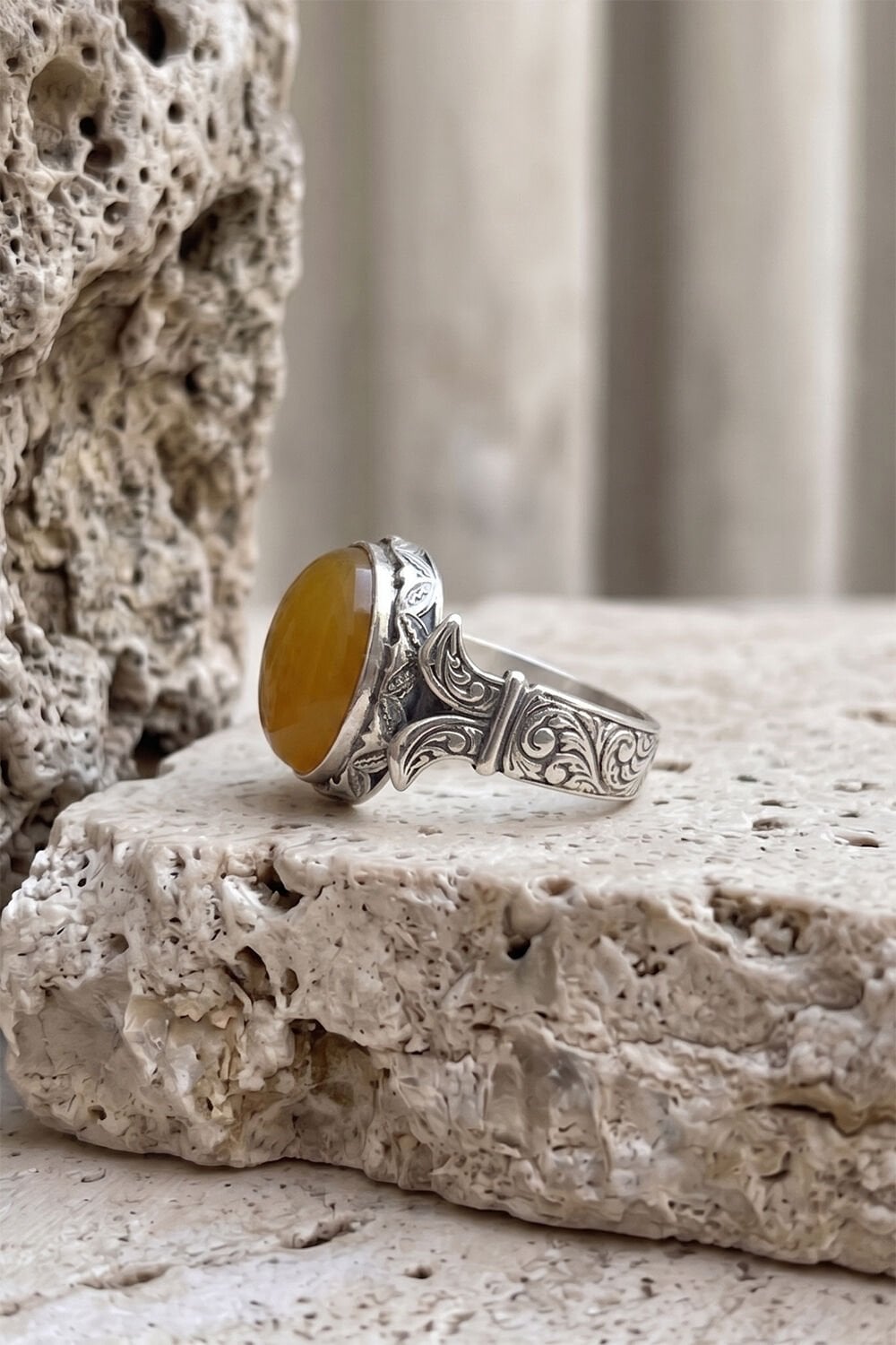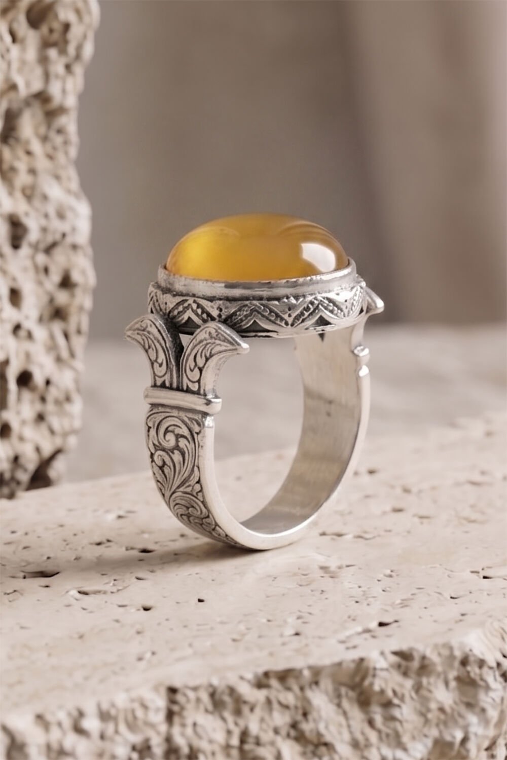 Bu yüzük, seri üretim fabrikasyon ürünlerin aksine tamamen el işçiliği ile üretilmiştir. Gövdesinde kullanılan 925 ayar gümüş, yan kısımlardaki ince motiflerle zenginleştirilerek maskülen bir şıklık sunar. Merkezde yer alan 16x16 mm ölçüsündeki sarı akik taşı, güneşin sıcak tonlarını ve doğal taşın pozitif enerjisini stilinize taşır.