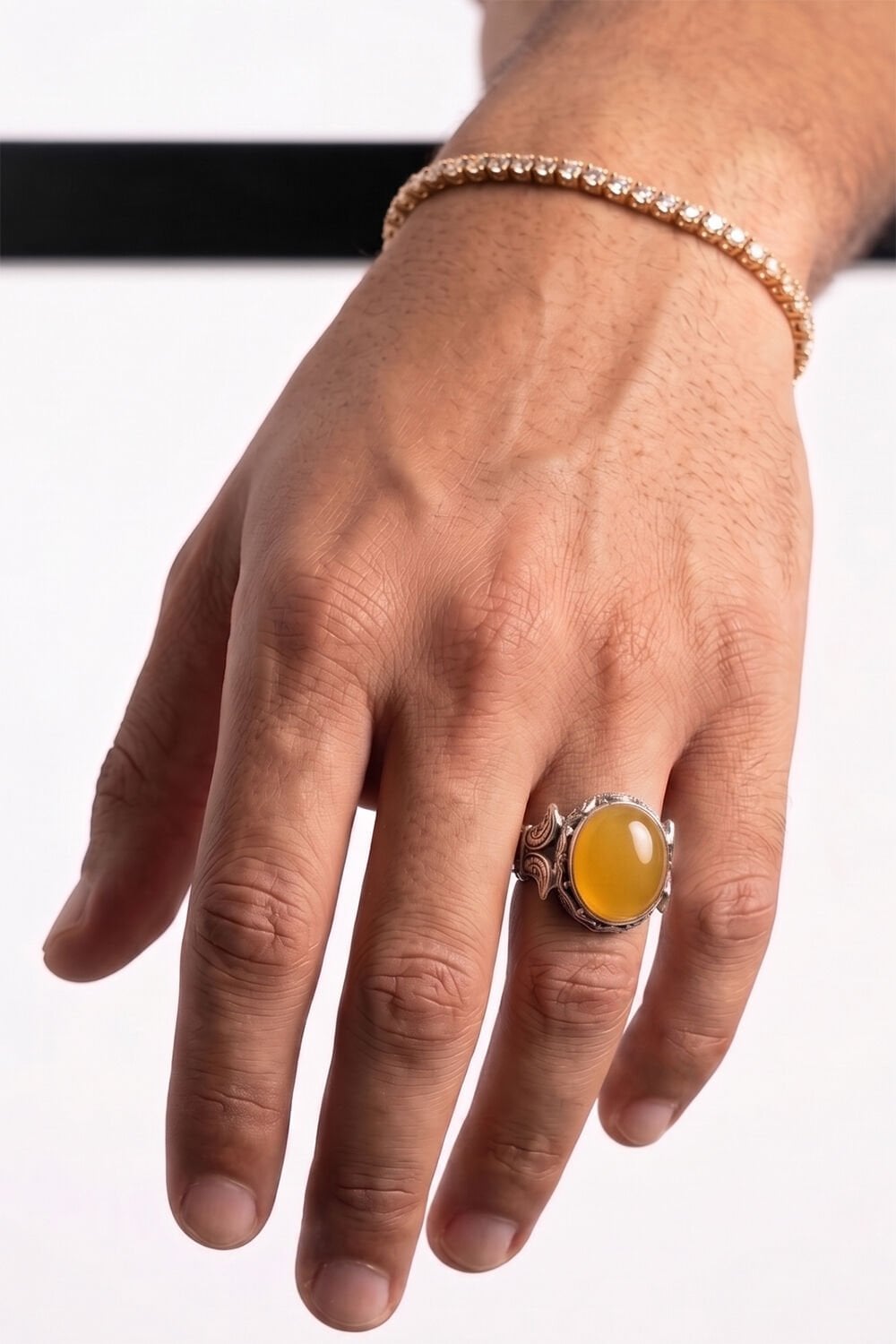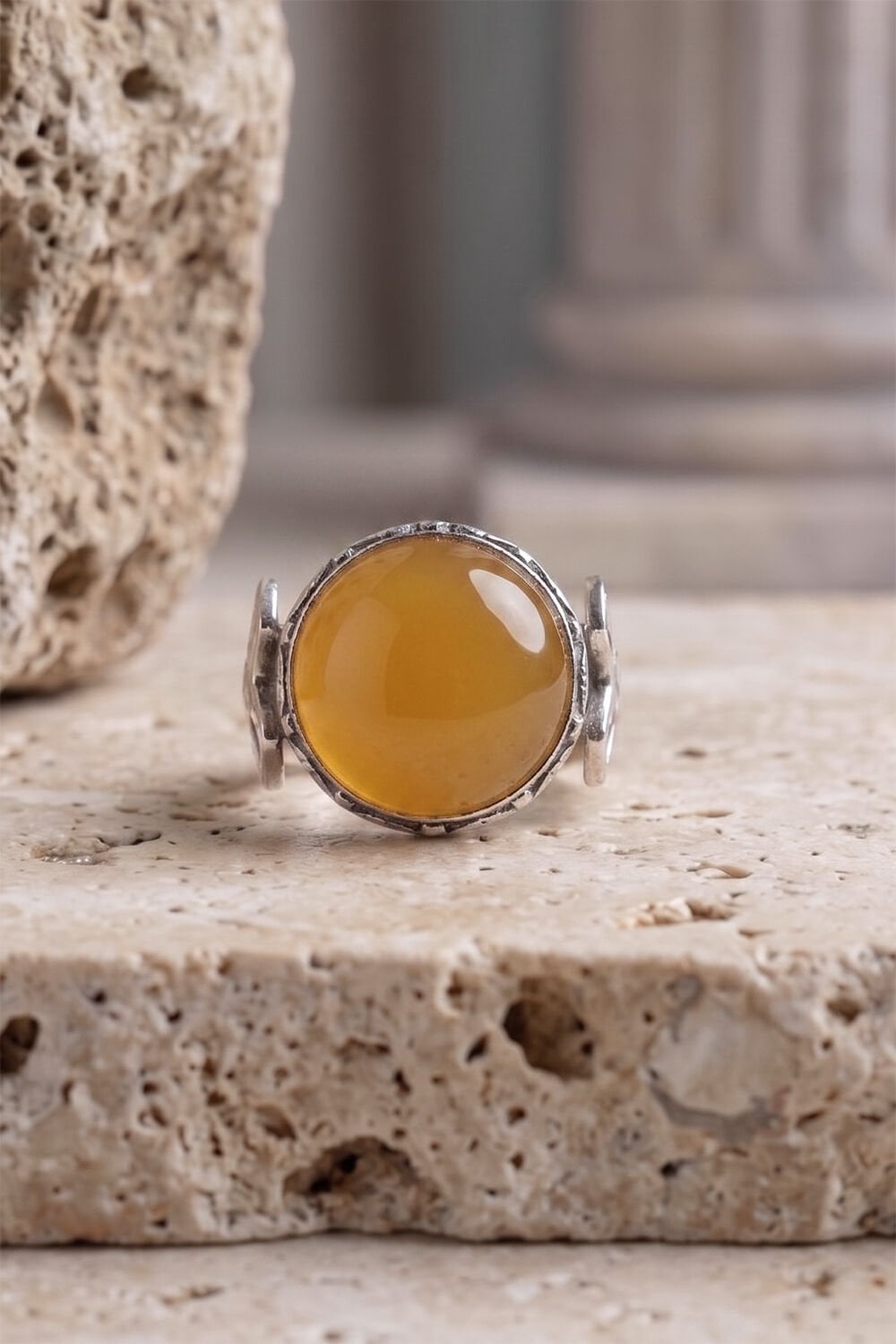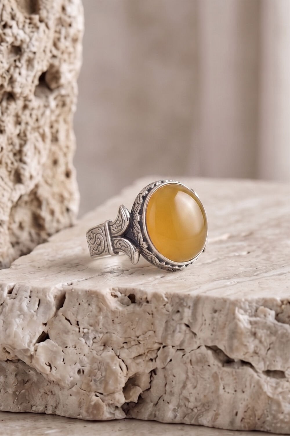Bu yüzük, seri üretim fabrikasyon ürünlerin aksine tamamen el işçiliği ile üretilmiştir. Gövdesinde kullanılan 925 ayar gümüş, yan kısımlardaki ince motiflerle zenginleştirilerek maskülen bir şıklık sunar. Merkezde yer alan 16x16 mm ölçüsündeki sarı akik taşı, güneşin sıcak tonlarını ve doğal taşın pozitif enerjisini stilinize taşır.