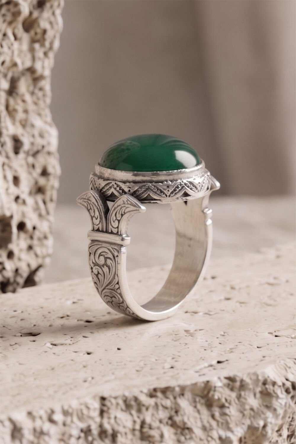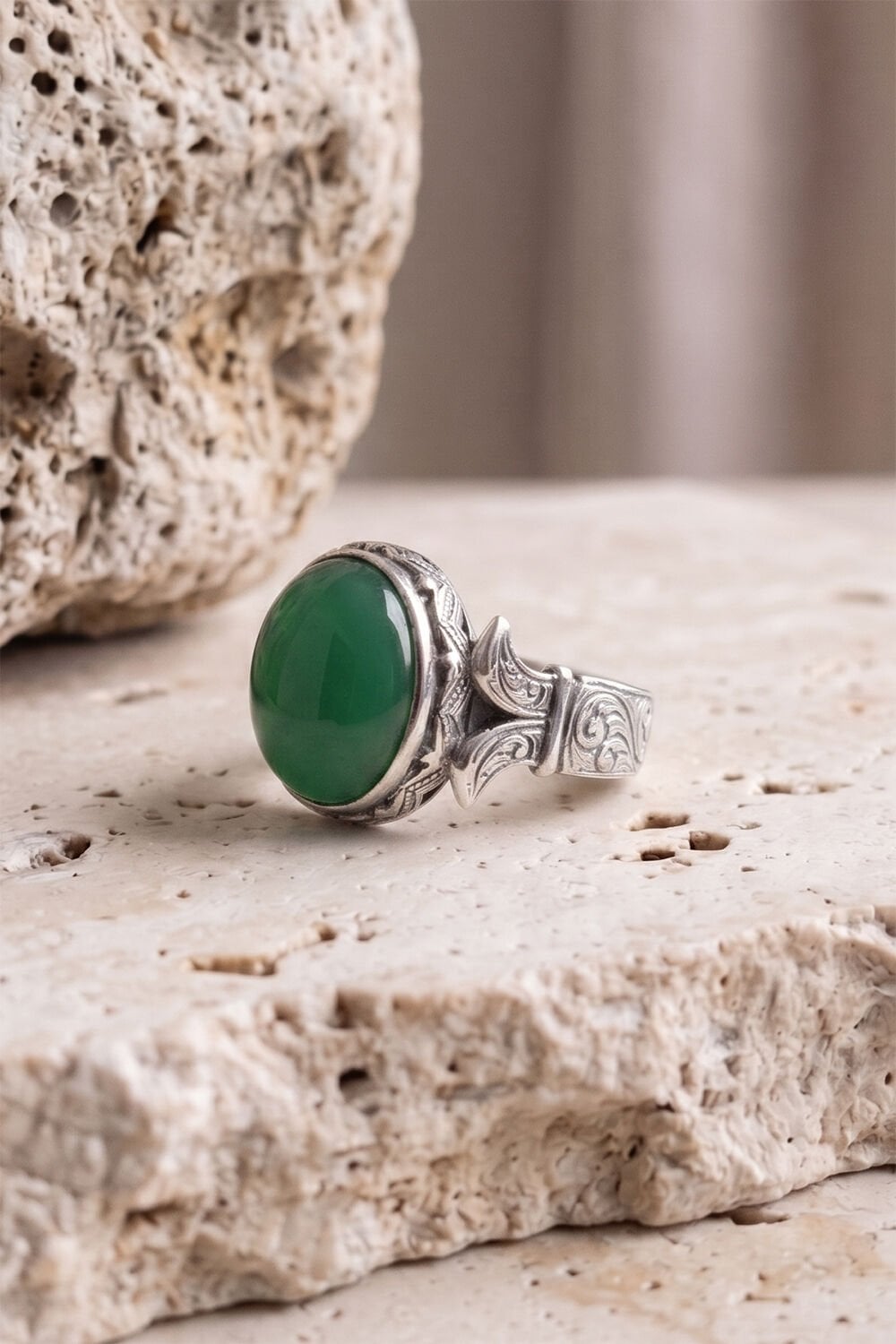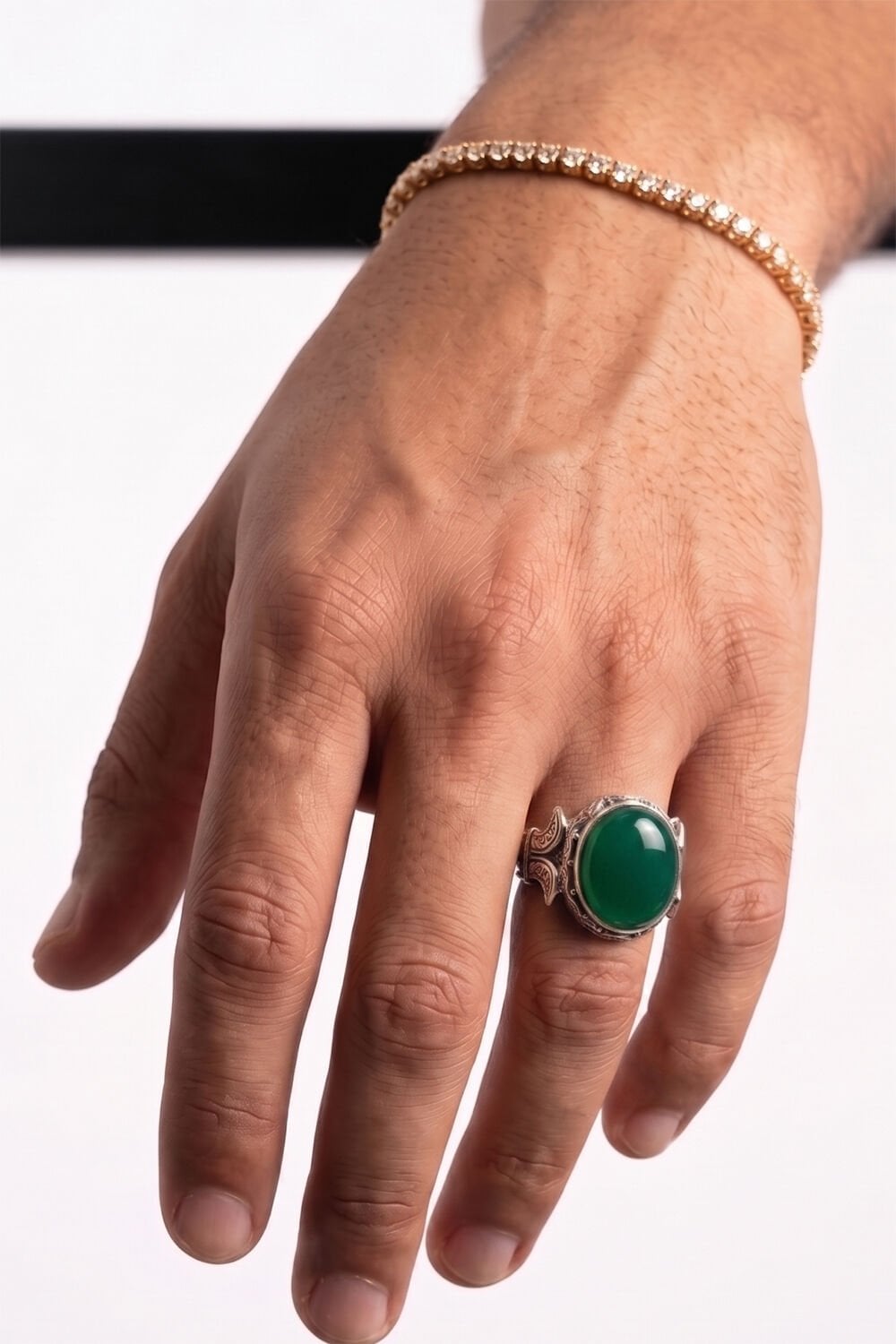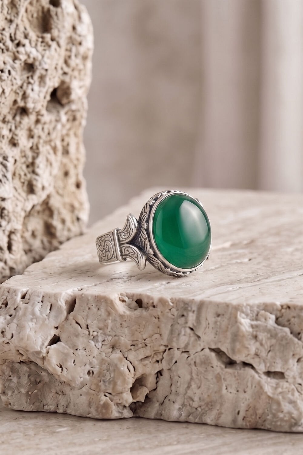 Katre Model Yeşil Akik Taşlı Gümüş Erkek Yüzük