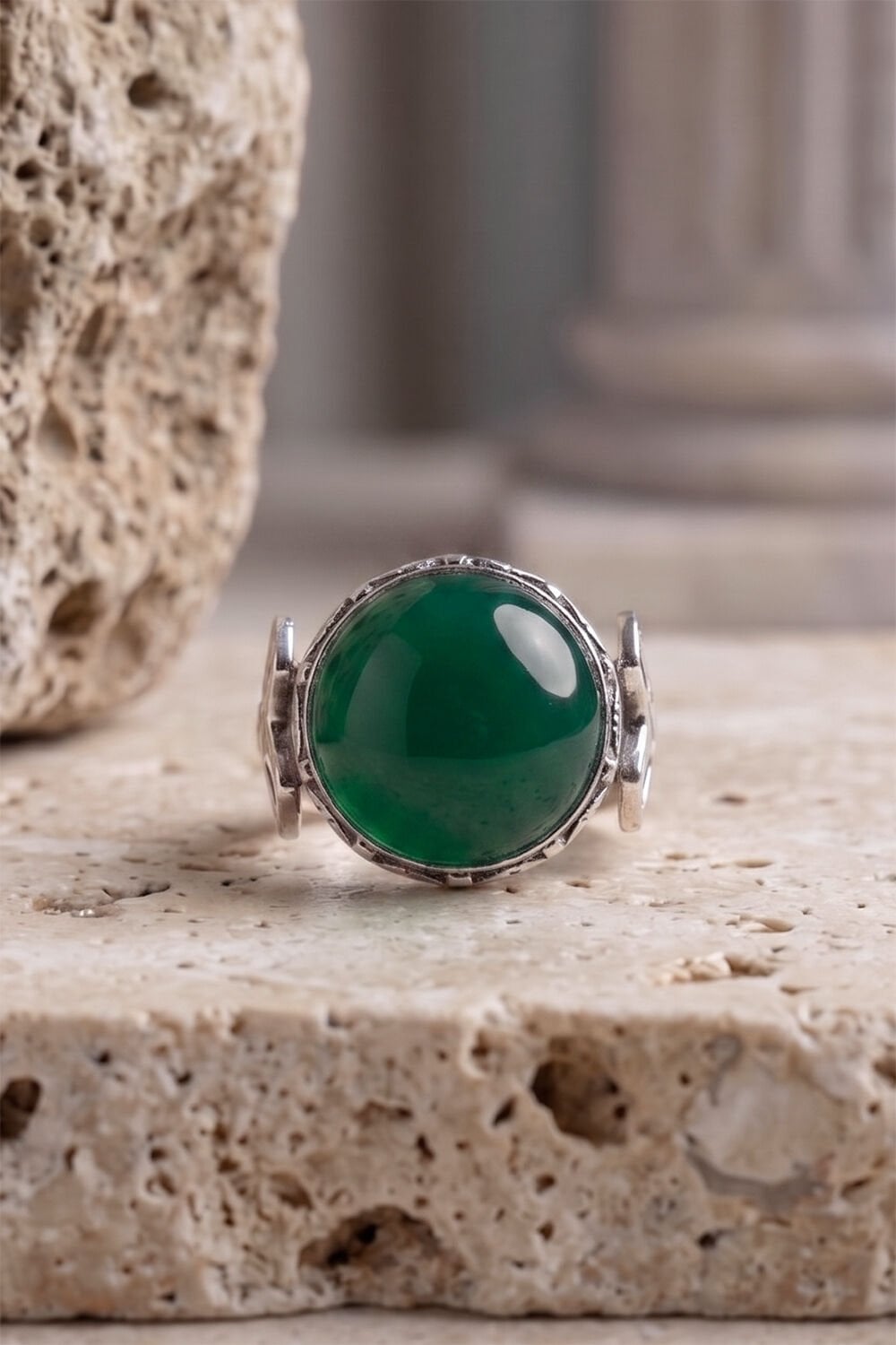 925 Ayar Gümüş Katre Model Yeşil Akik Taşlı El İşçiliği Erkek Yüzük