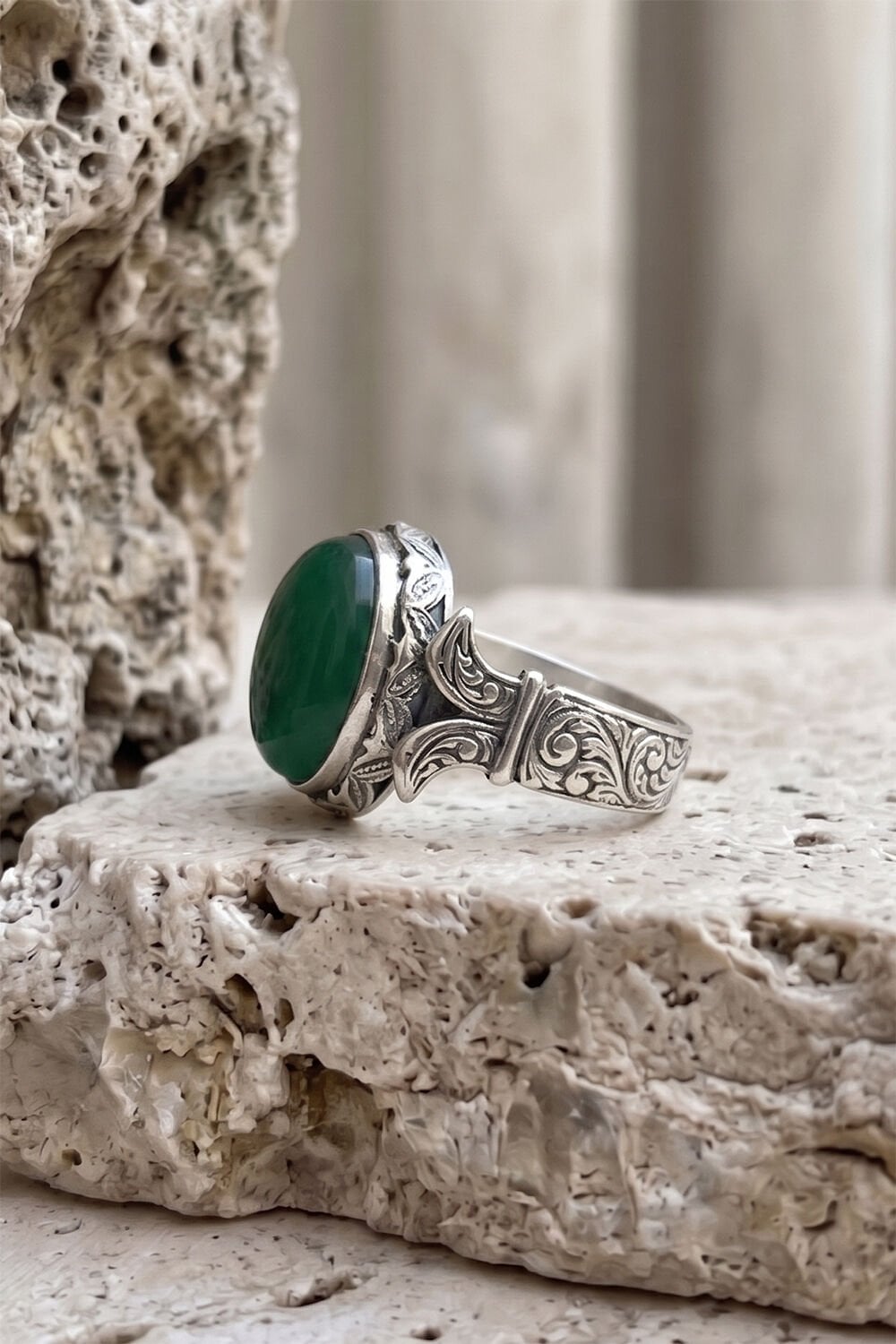 Yüzüğün yan kısımlarında yer alan ince kalem işçiliği detayları, 925 ayar gümüşün kalitesiyle birleşerek parmağınızda adeta bir sanat eseri taşımanızı sağlıyor. Merkeze yerleştirilen 16x16 mm ölçülerindeki doğal yeşil akik taşı, hem rengiyle göz kamaştırıyor hem de doğanın enerjisini kombinlerinize taşıyor.