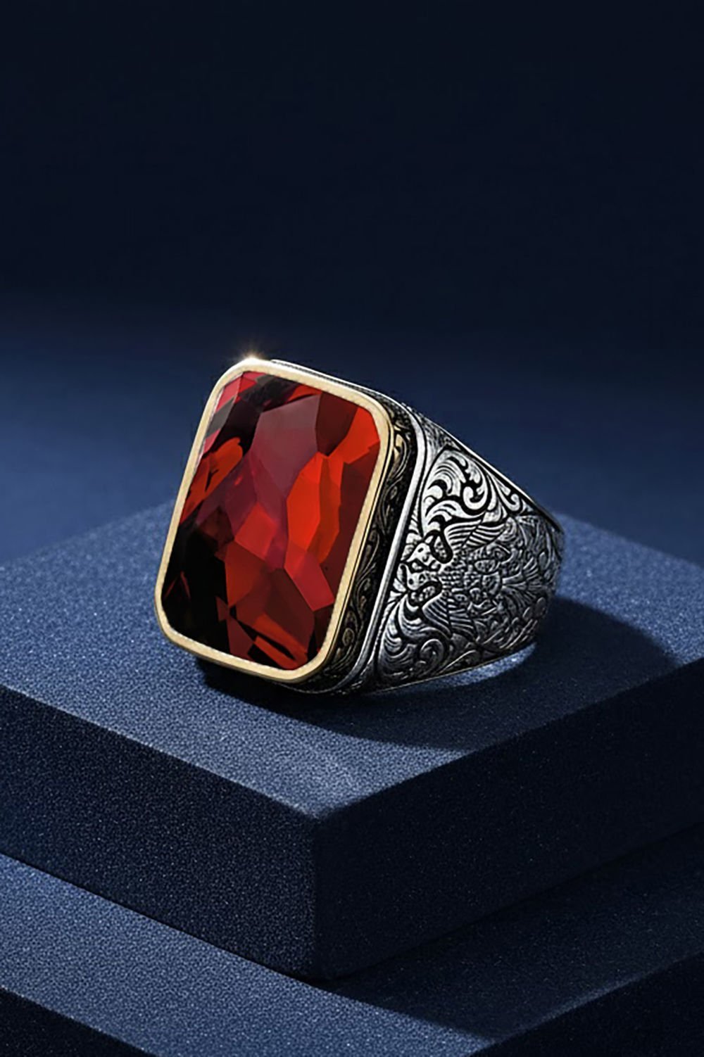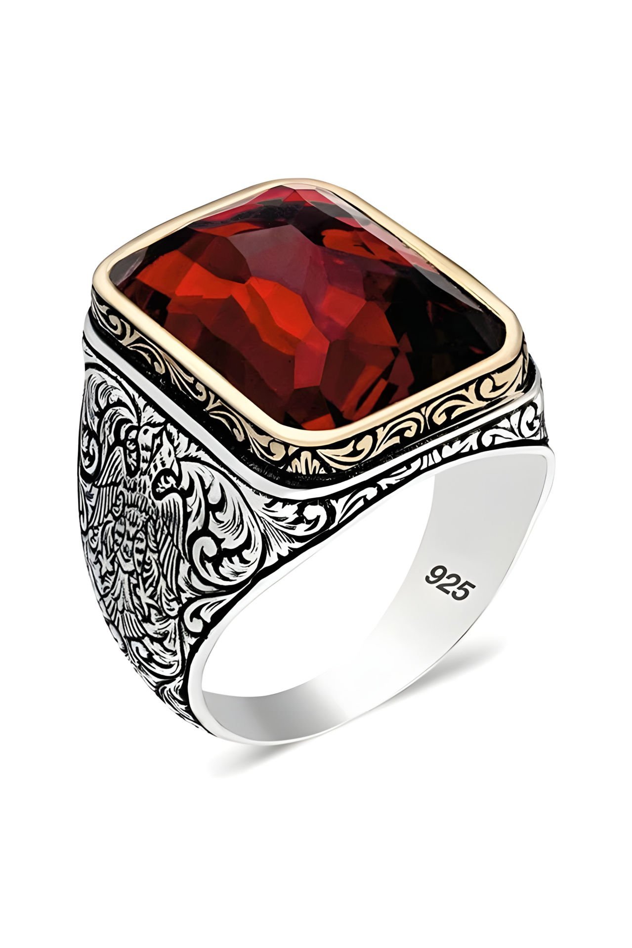 Bu özel erkek yüzük, kırmızı zirkon taşıyla tasarlanmış ve el işçiliği ile özenle hazırlanmıştır. 925 ayar gümüş malzeme kullanılarak üretilmiş olan bu yüzük, şıklık ve zarafeti bir araya getiriyor.