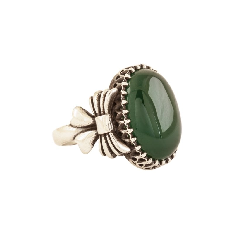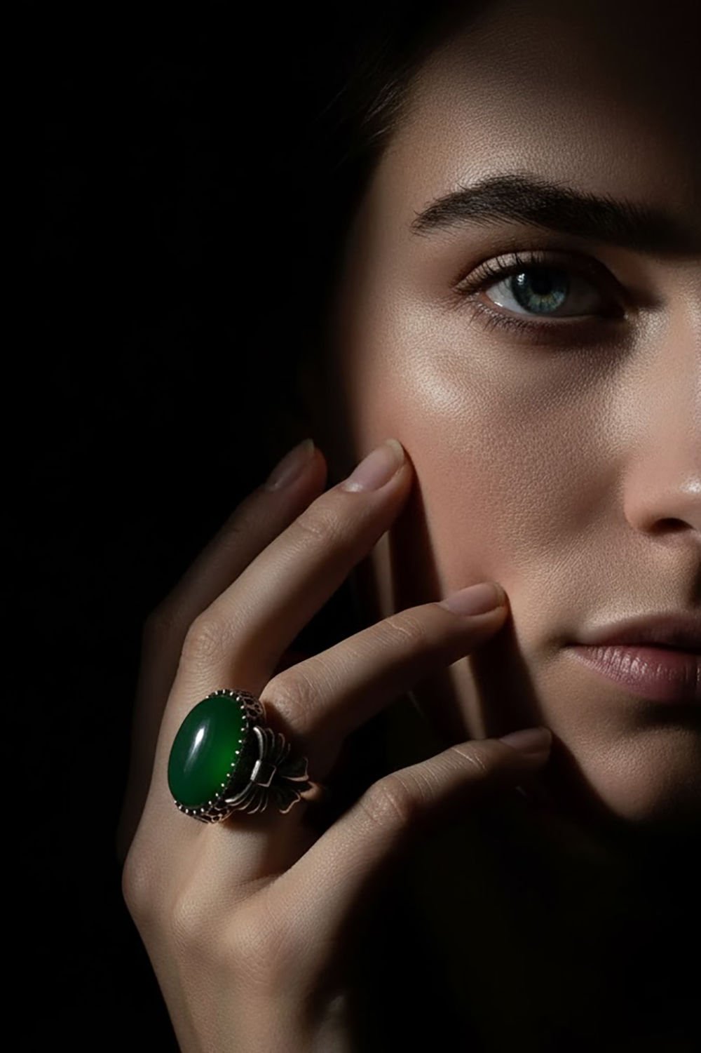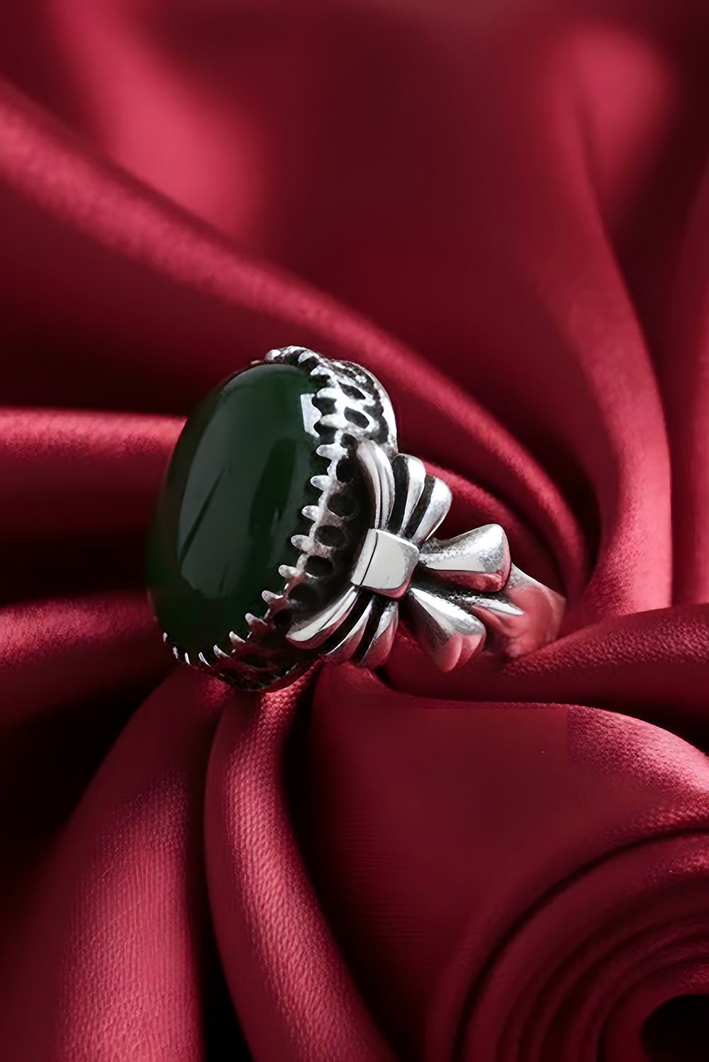 Natural yeşil akik taşının canlı tonları, yüzüğe özel bir karakter ve doğanın tazeliğini katarken, 925 ayar gümüş yüzük, el işçiliği detaylarıyla özel bir atmosfer yaratıyor. Zarif kurdele modeli, modern tasarımı ve gümüşün zarafetiyle birleşerek bu yüzüğü benzersiz kılıyor.