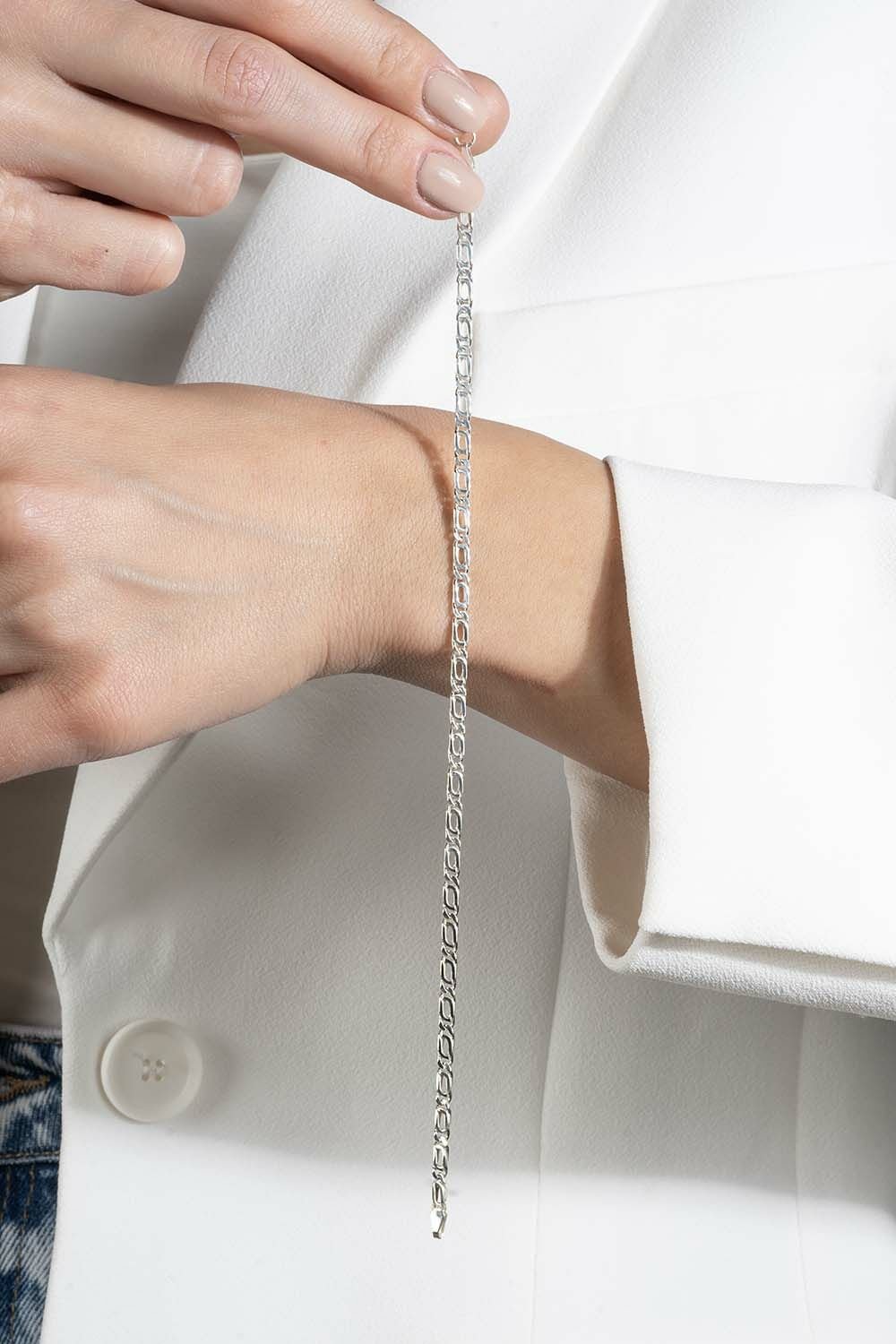 Farklı renklerde (silver, gold, rose) hazırlayabildiğimiz, klasik desenlere sahip gümüş zincir bileklik modelimiz. Bileklik, 925 ayar gümüş ile imal edilmiştir. Sipariş verildikten sonra 1-2 iş günü içerisinde kargoya verilir.