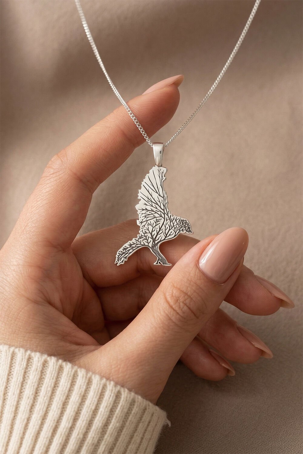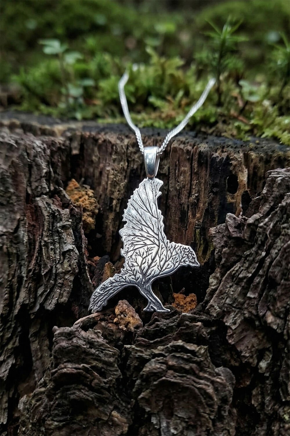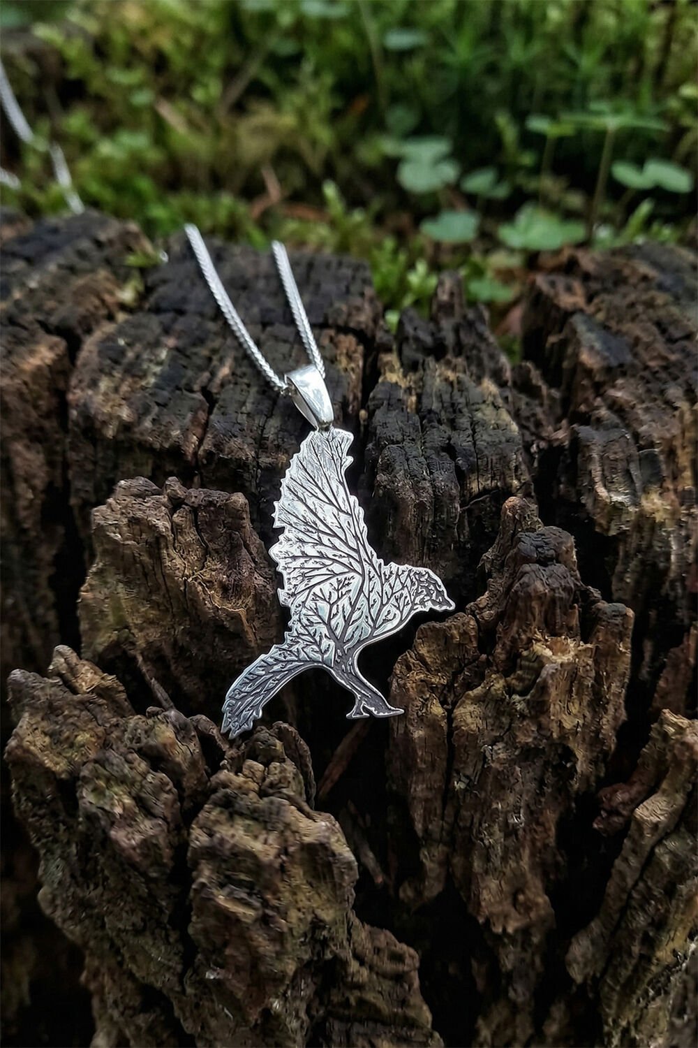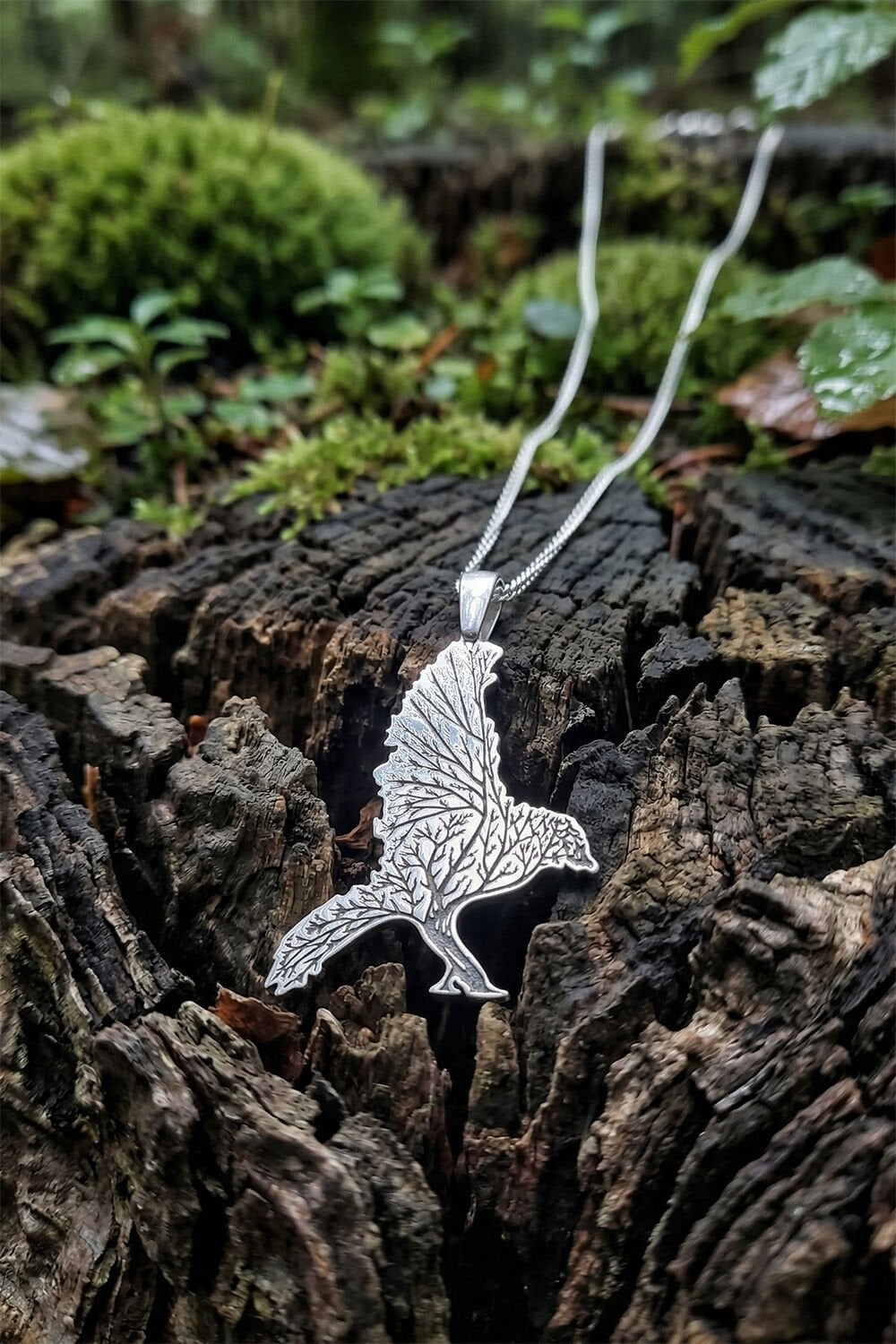 925 Ayar Gümüş Kuzgun ve Hayat Ağacı Tasarım Unisex Kolye – 55 cm Zincirli
