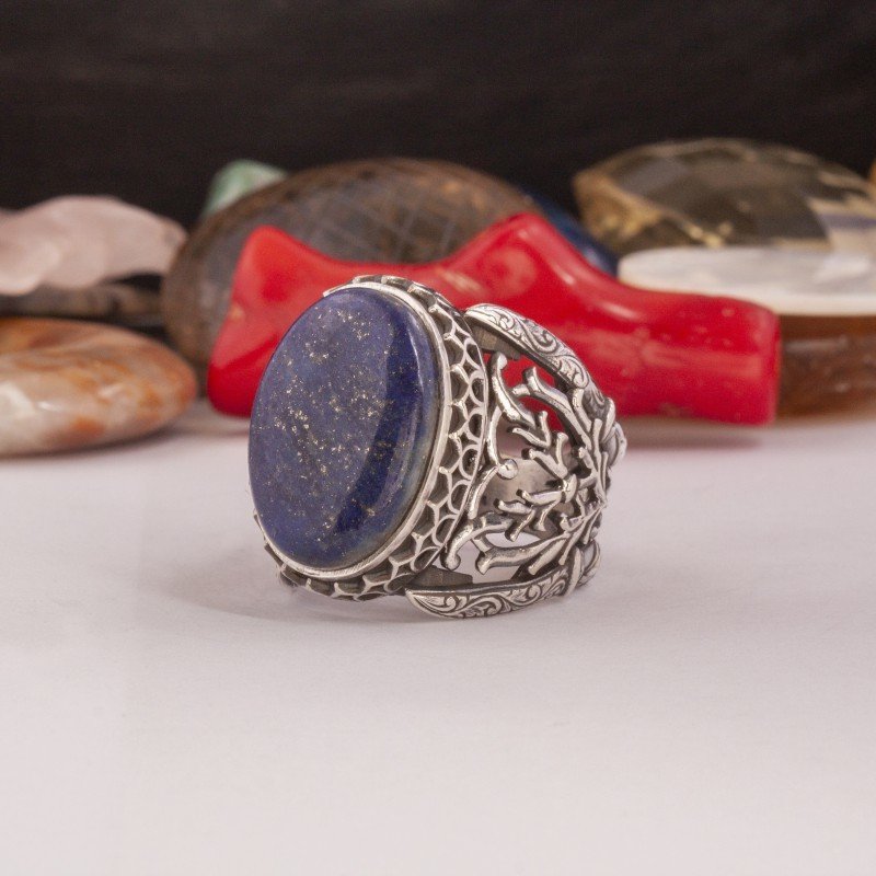 - Doğal Lapis Lazuli Taşı: Yüzüğün merkezinde yer alan doğal lapis lazuli taşı, rengarenk tonları ve doğal desenleri ile öne çıkar. Taşın eşsizliği her yüzüğü özel kılar.