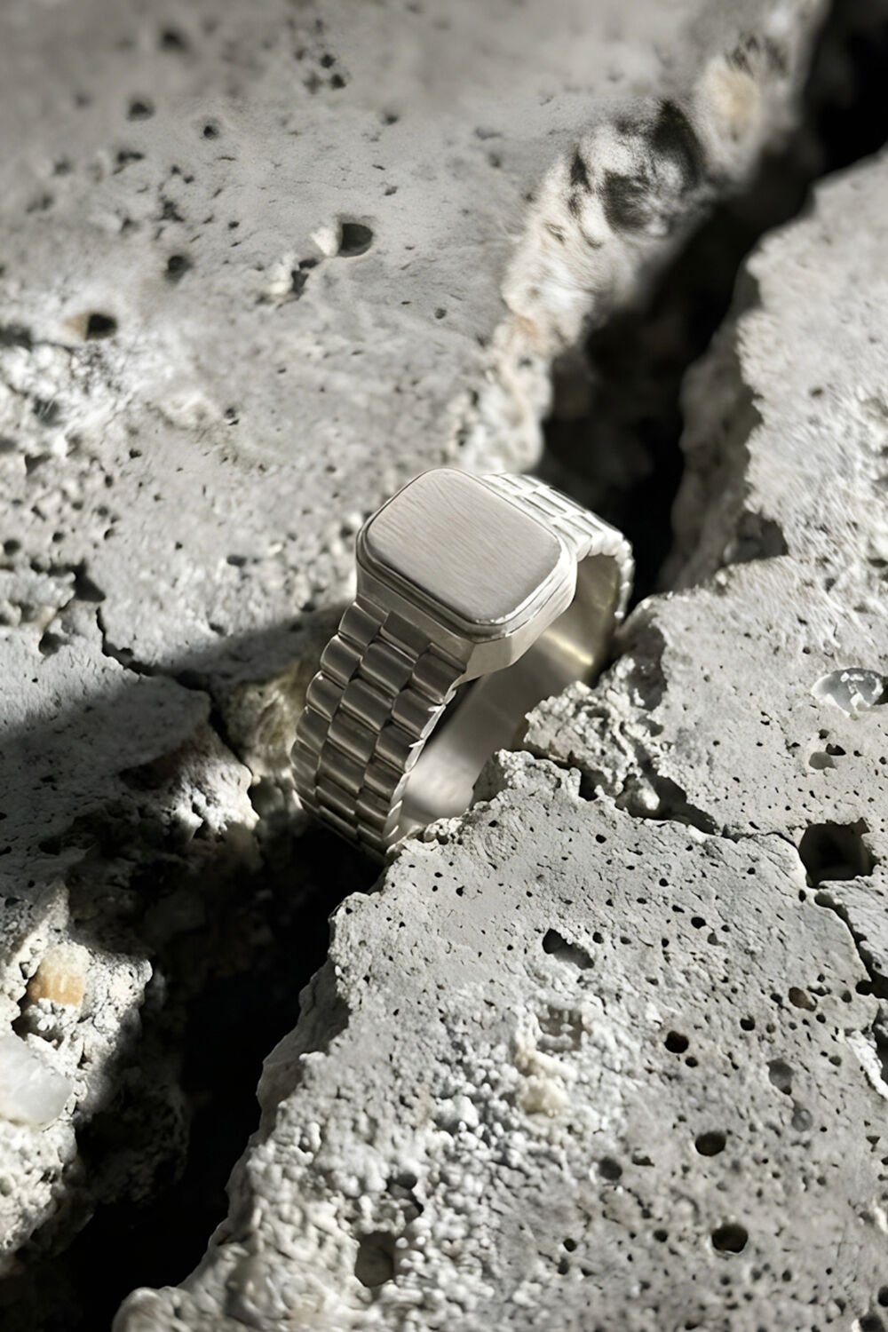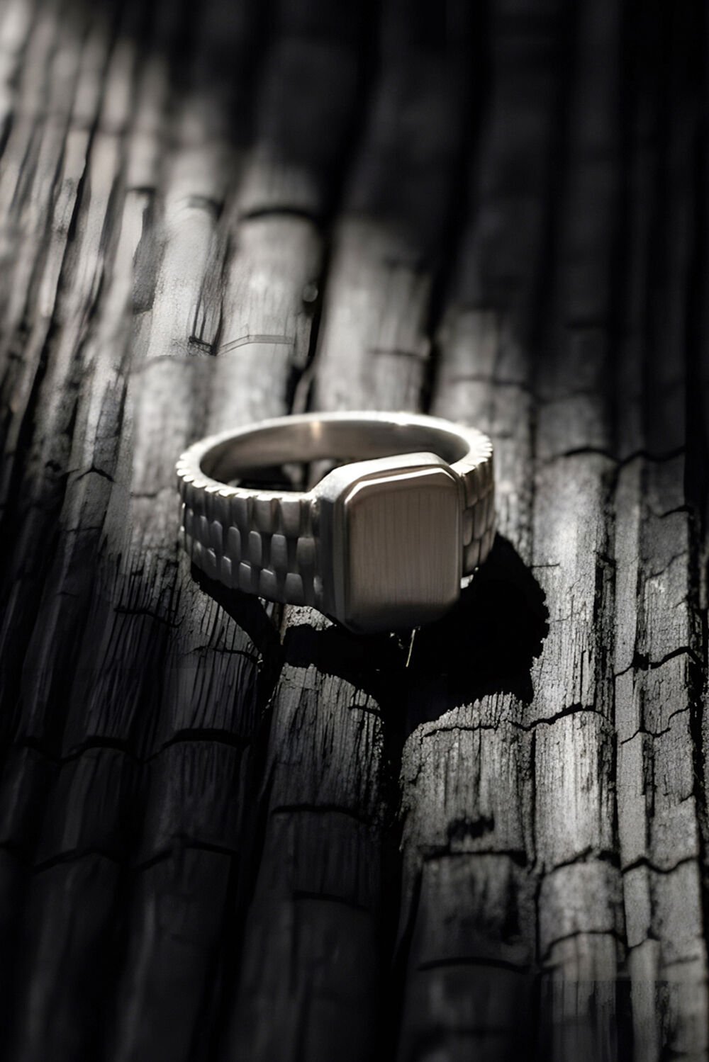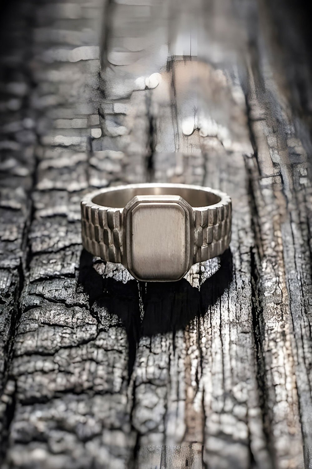 Geleneksel şövalye yüzüğü formunu, modern ve endüstriyel bir estetikle birleştiren bu özel tasarım, tarzında fark yaratmak isteyen erkekler için tasarlandı. 925 ayar gümüşten üretilen ve saat kordonu motifleriyle bezenmiş bu yüzük, mat bitişi sayesinde hem ağırbaşlı hem de dikkat çekici bir görünüm sunar.