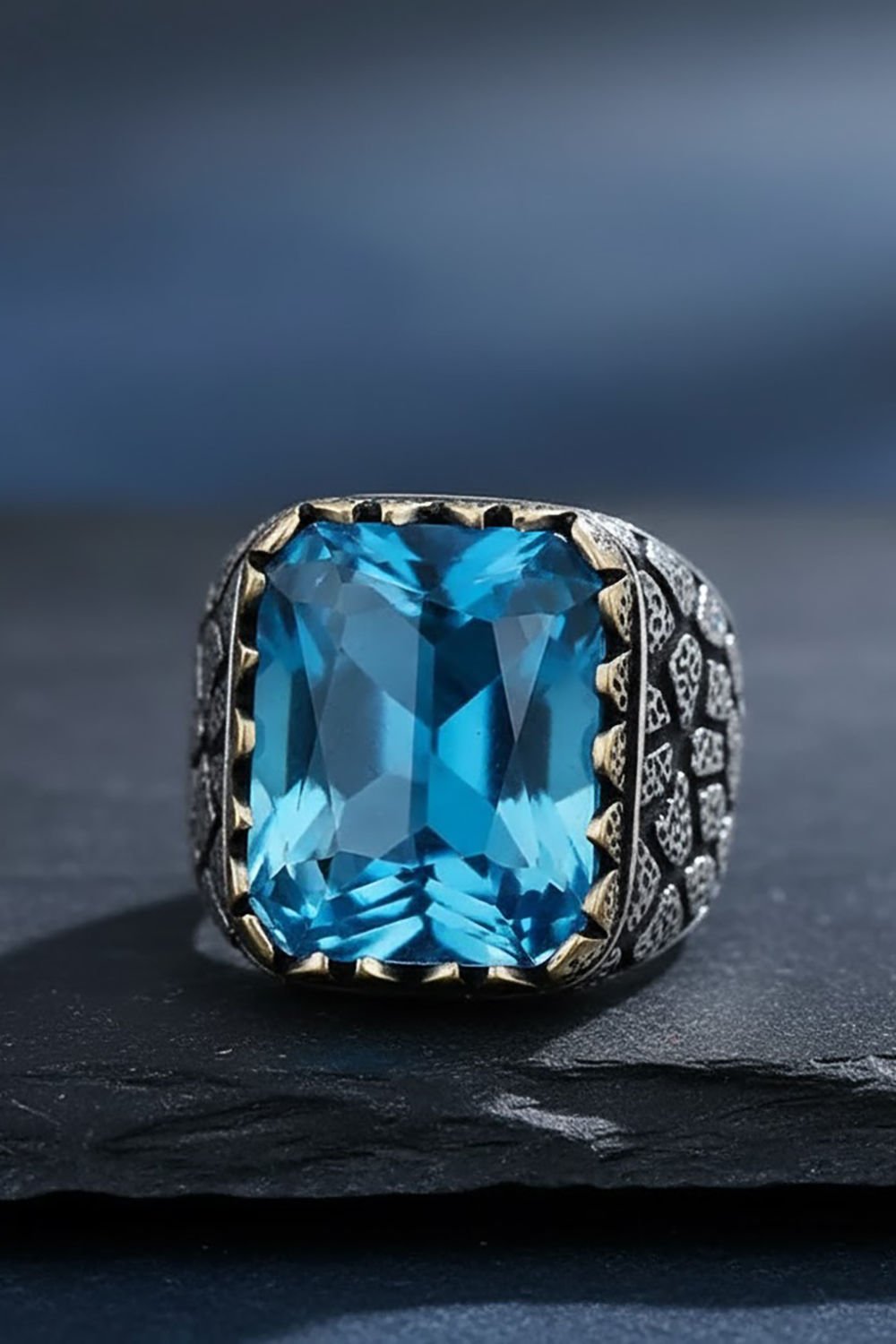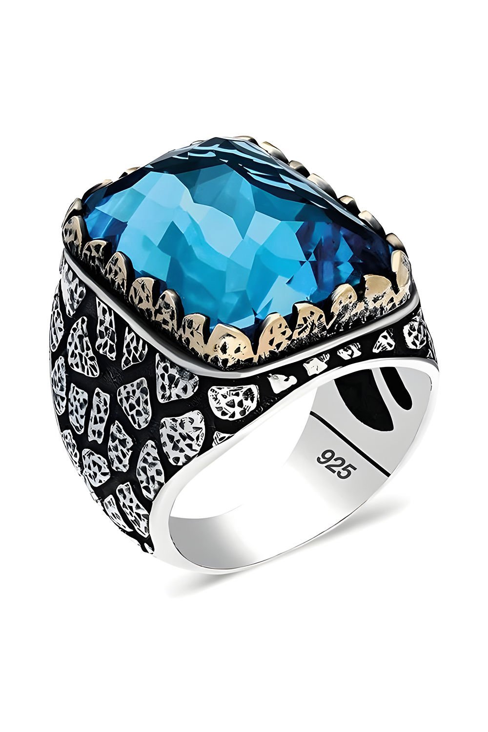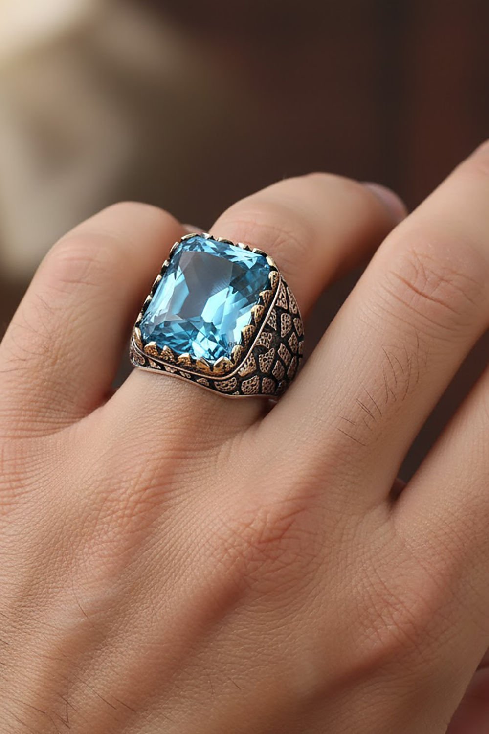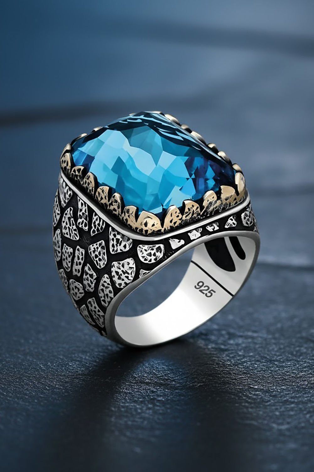 Bu özel erkek yüzük, doğal mavi zirkon taşı ve el işçiliği ile 925 ayar gümüşten üretilmiştir. Her detayı özenle işlenmiş olan bu yüzük, zarafet ve şıklığı bir araya getirir.