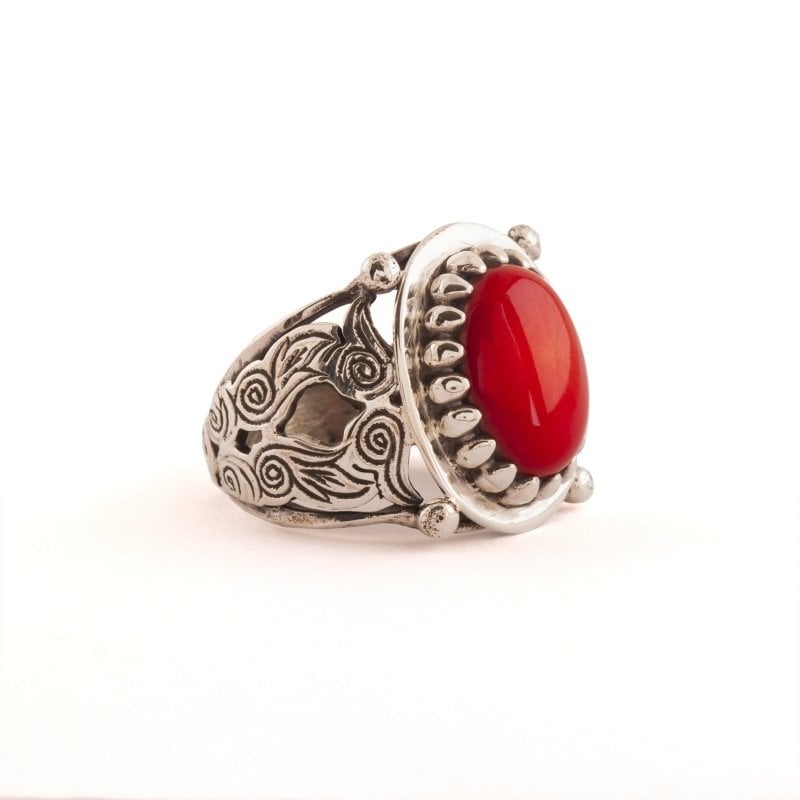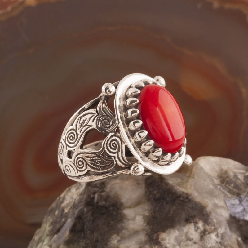Mercan Taşlı El İşi Gümüş Yüzük |