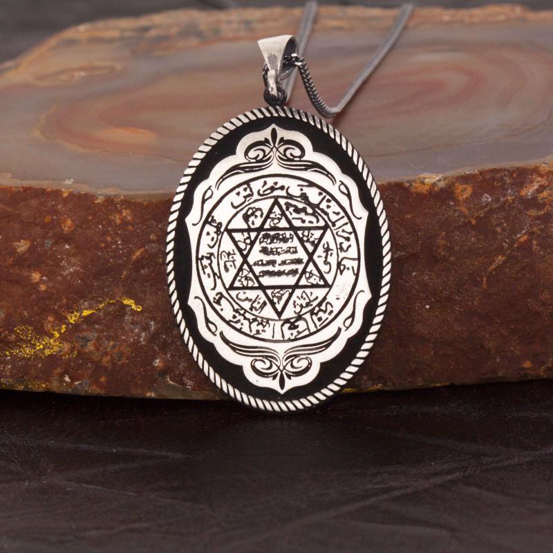 Hz. Süleyman'ın mührü olduğu rivayet edilen Altı Köşeli Yıldız sembolünü kullandığımız gümüş kolye modelimiz. Kolye, 925 ayar gümüş ve kendi atölyemizin işçiliği ile hazırlanmıştır. Sipariş verildikten sonra 1-2 iş günü içerisinde kargoya verilir.