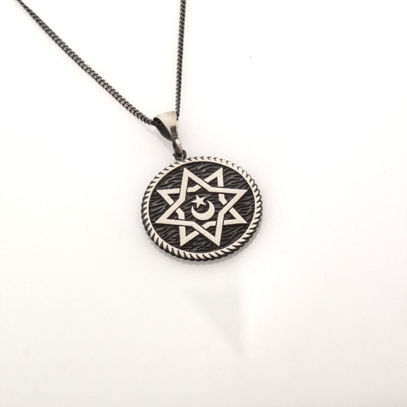 Bazı kaynaklara göre 6, bazılarına göre 8 köşeli anlatılan Mührü Süleyman içine Ay-Yıldız işlediğimiz gümüş kolye modelimiz. Kolye, 925 ayar gümüş ve kendi atölyemizin işçiliği ile hazırlanmıştır. Sipariş verildikten sonra 1-2 iş günü içerisinde kargoya verilir.