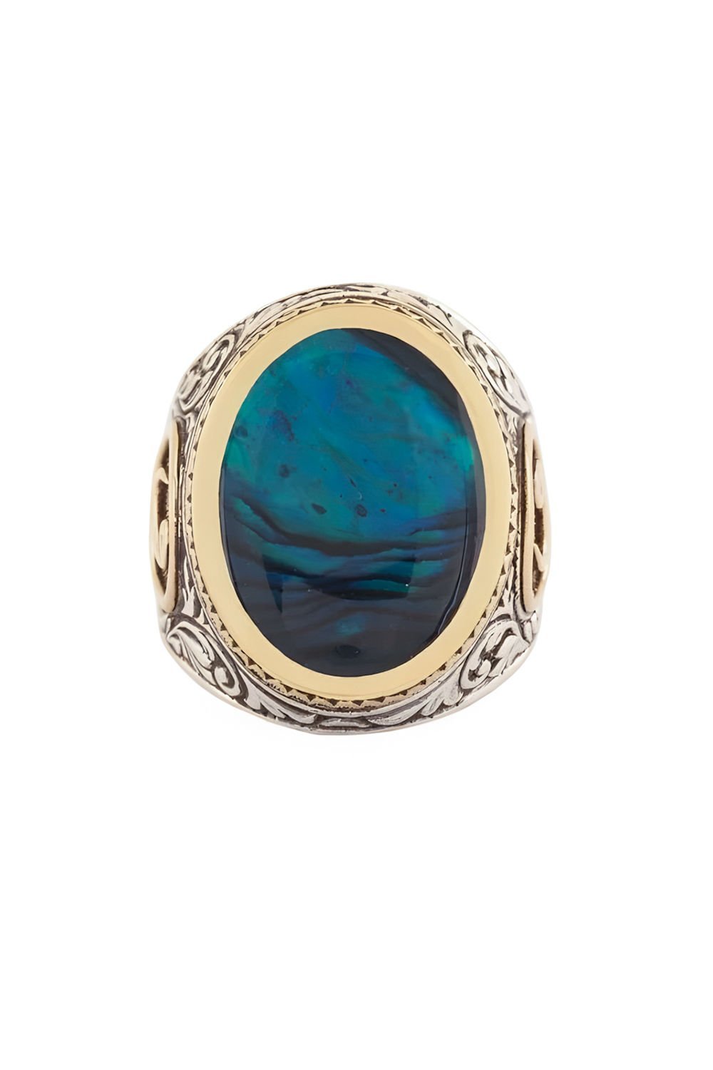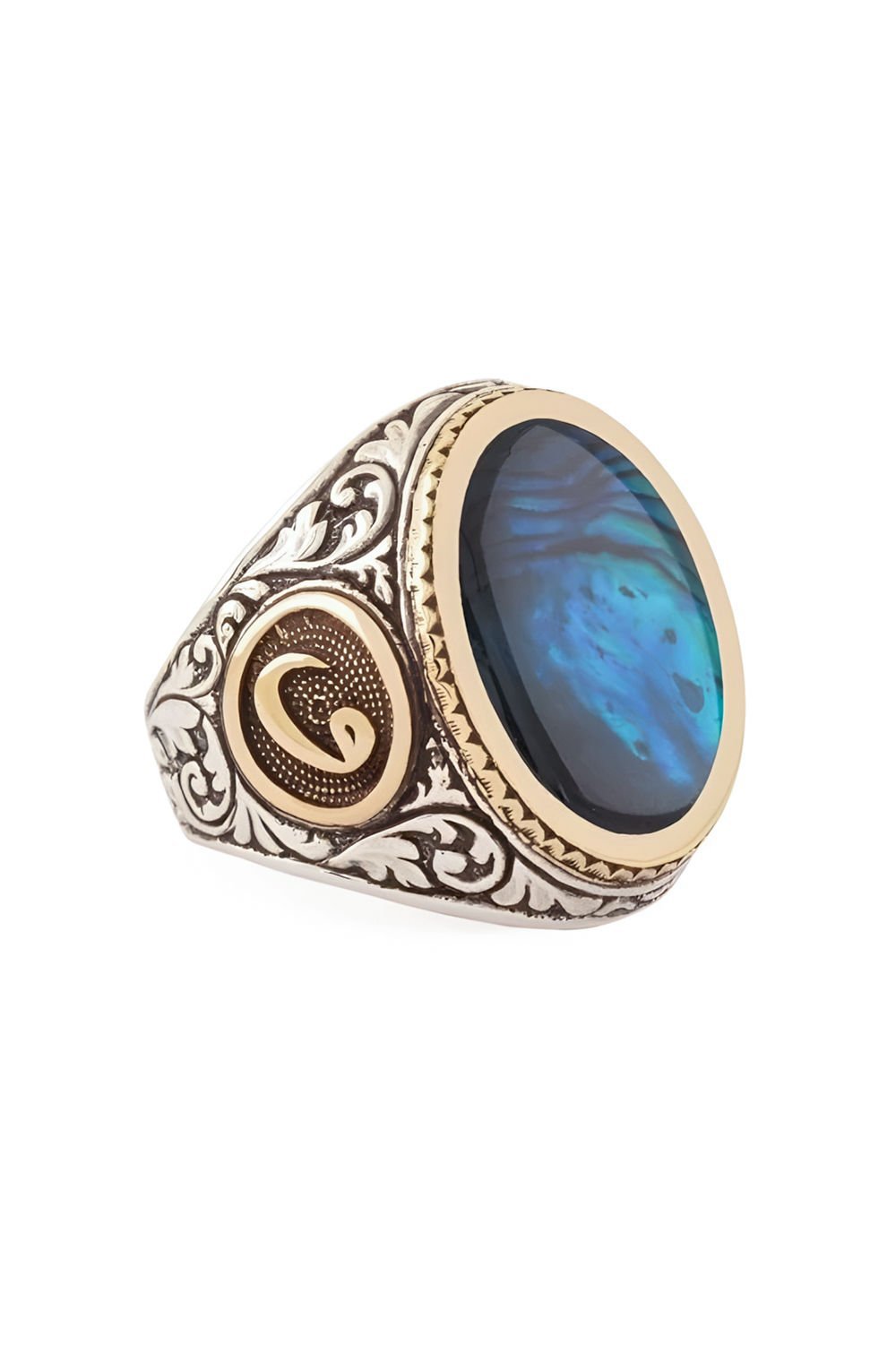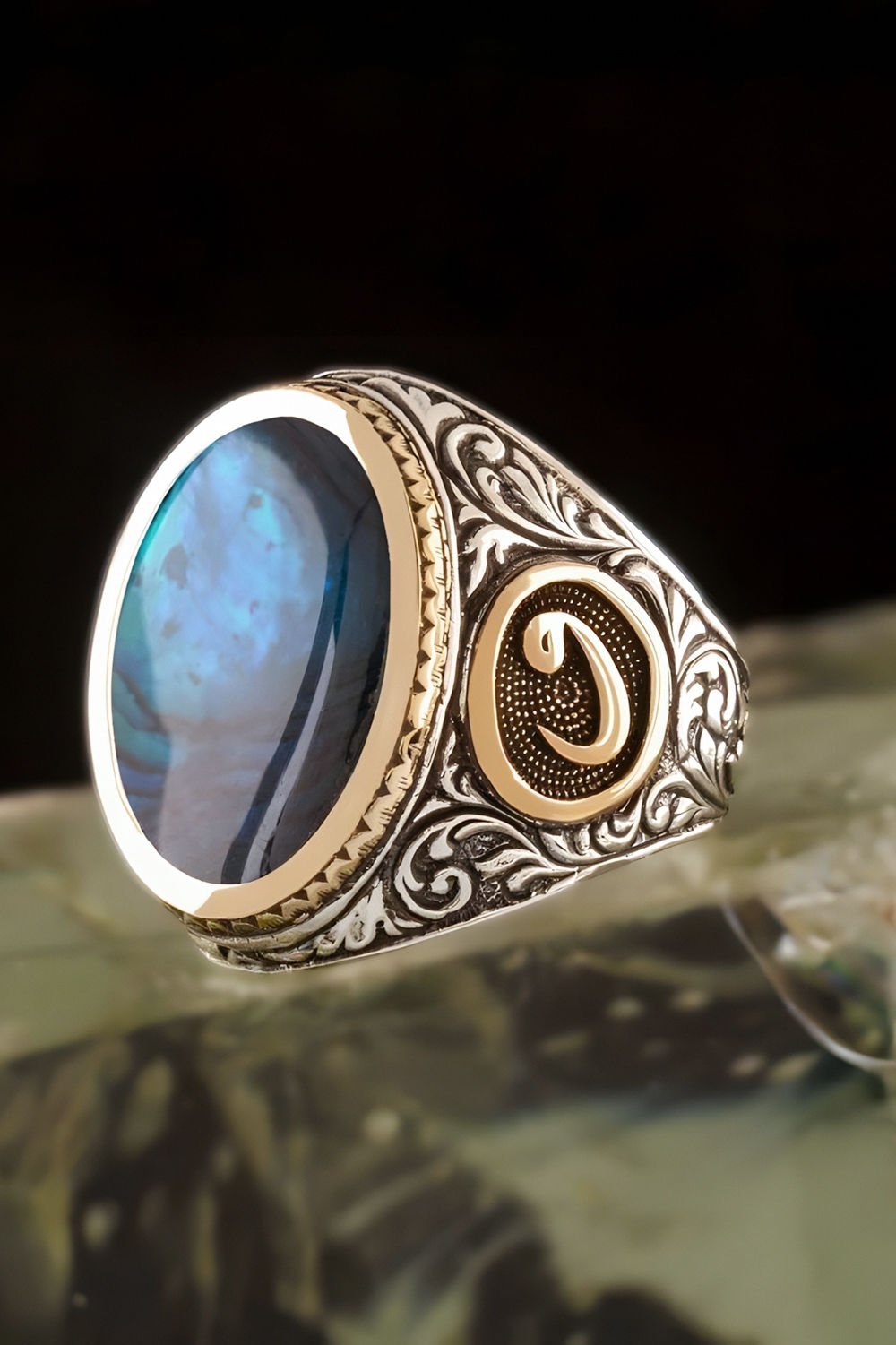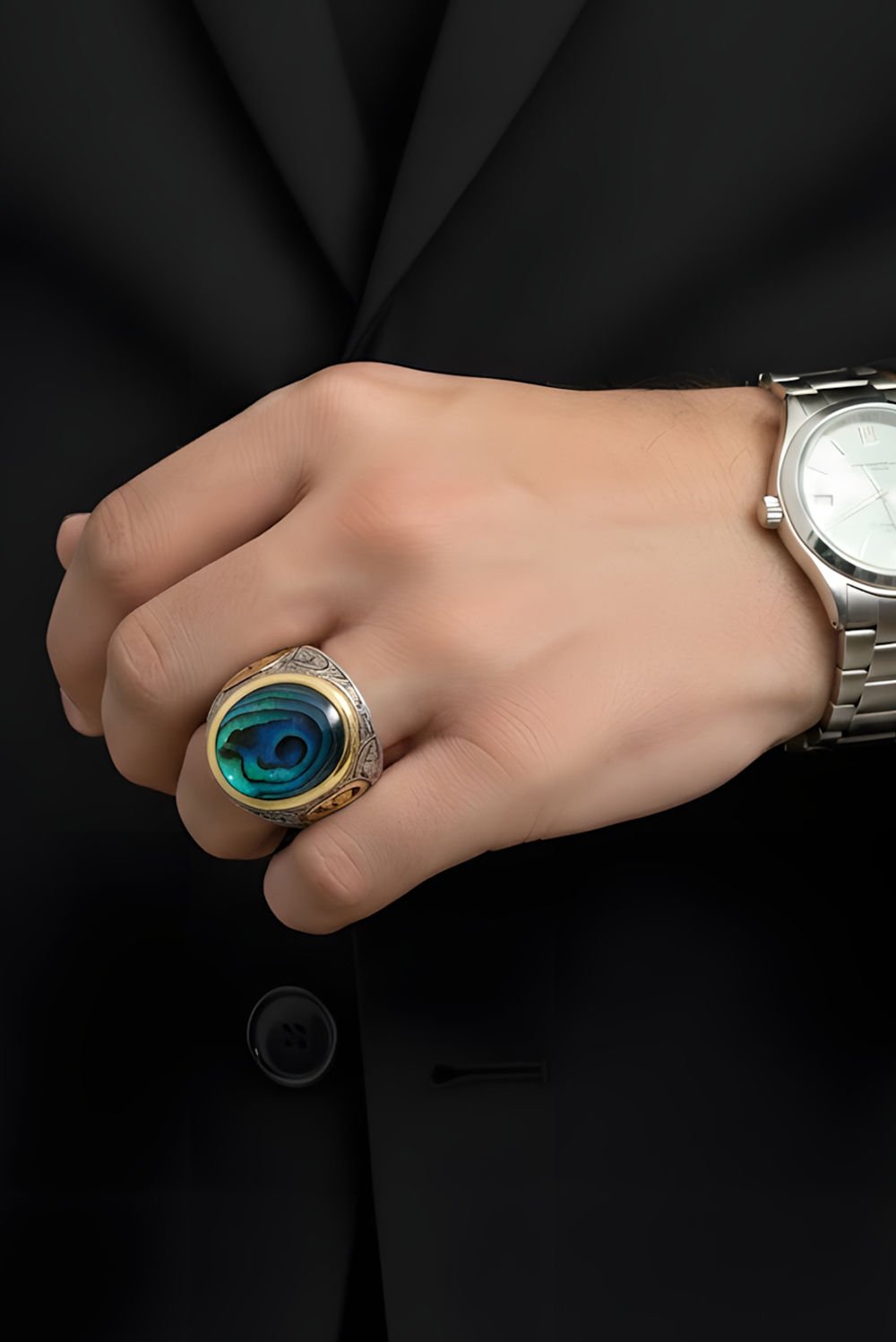 Hakiki ve orijinal doğal taşlar kullandığımız yüzüklerin bu modelinde kendine has rengi ve dokusuyla Okyanus Sedefi taşını kullanıyoruz.