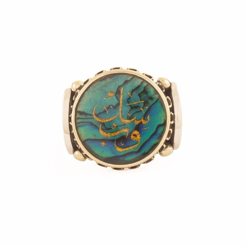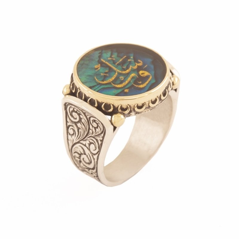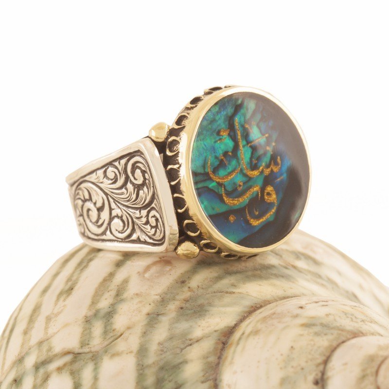 Doğal ve orijinal Okyanus Sedefi üzerine hattatlarımız tarafından kişiye özel gümüş yüzük modelimiz.