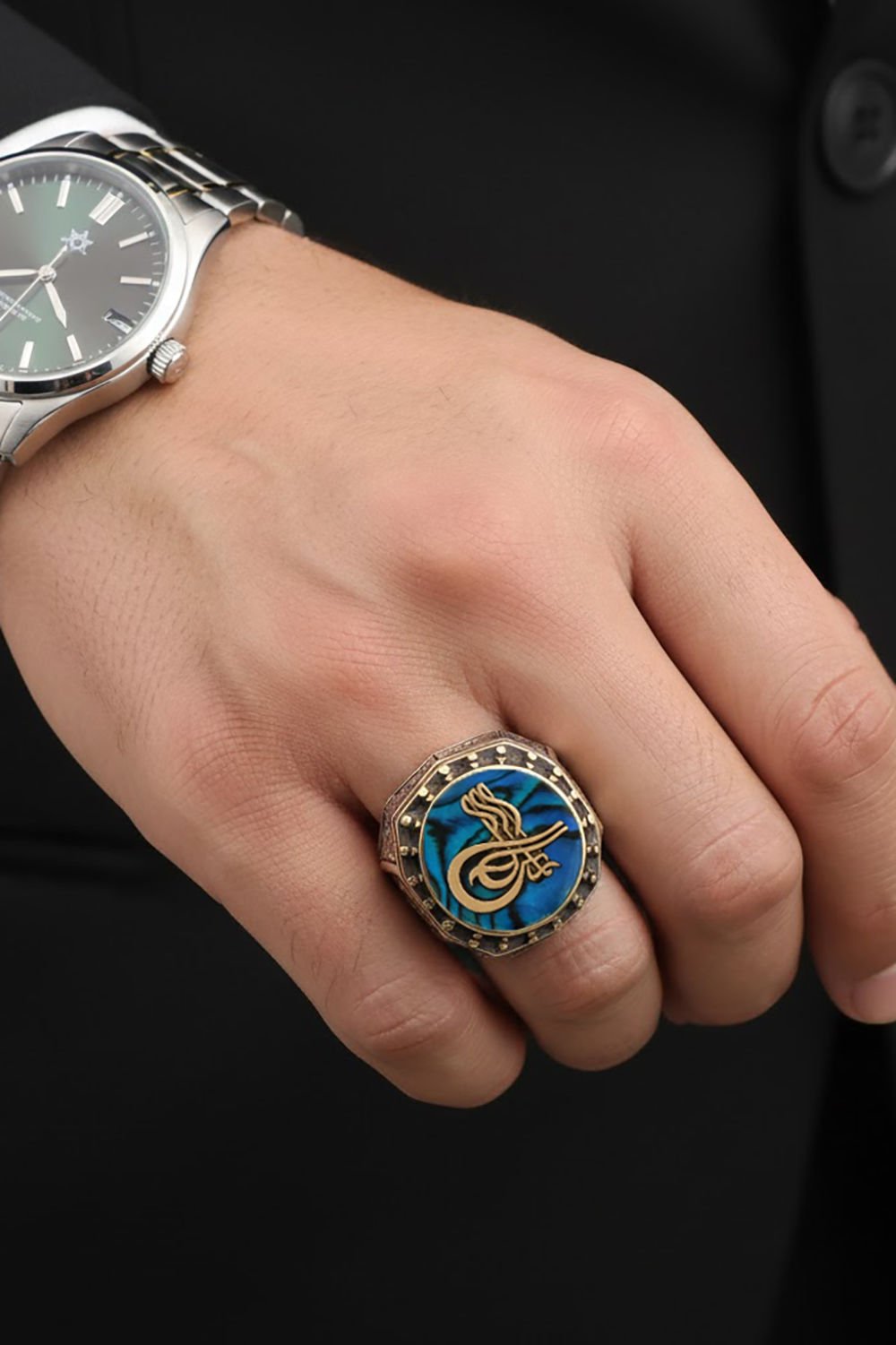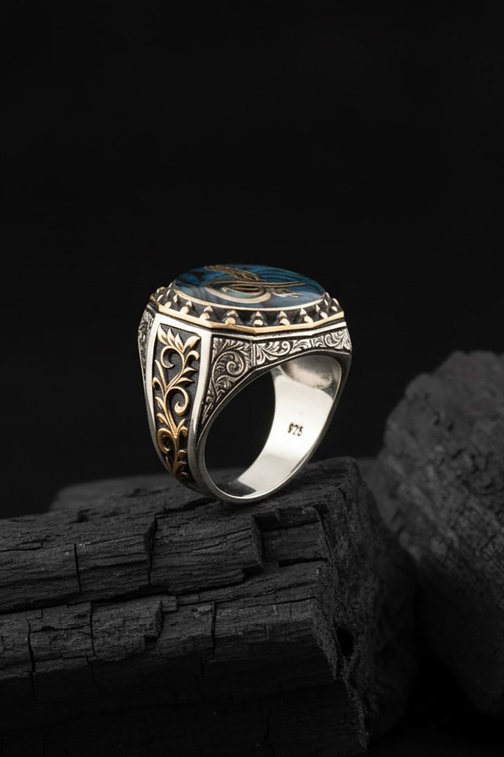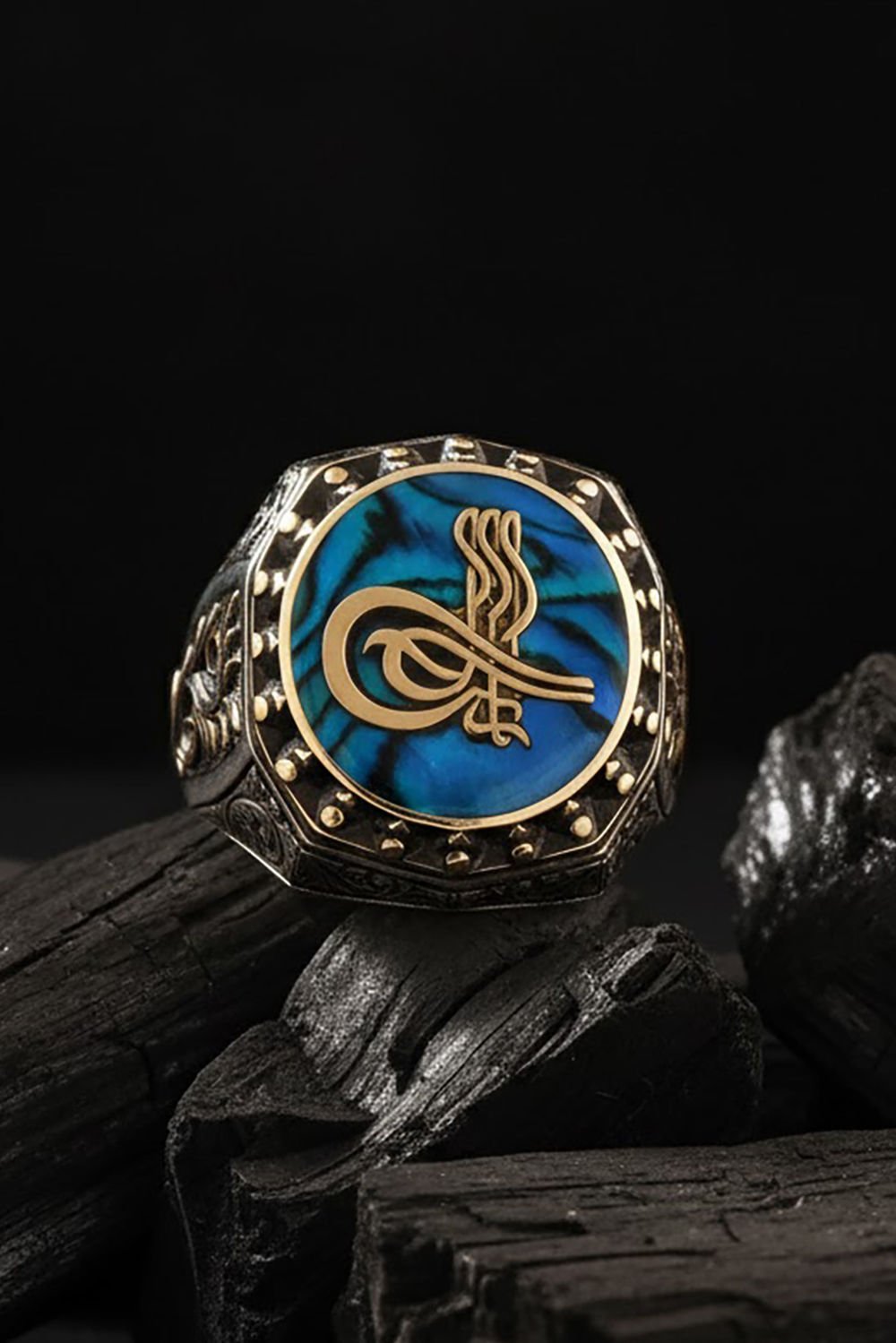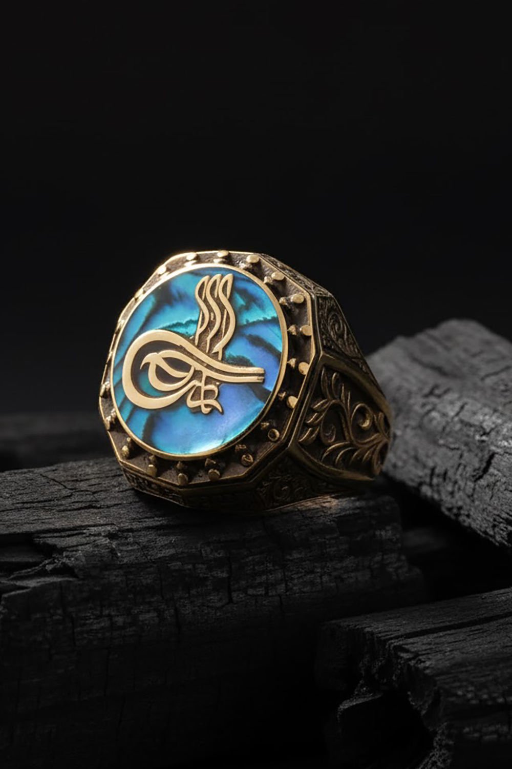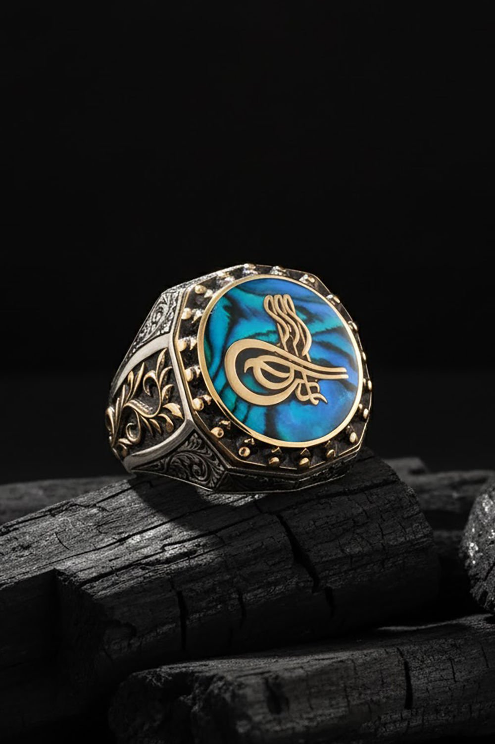 Okyanus Sedefi Tuğra Gravür Sarmaşık Yüzük |