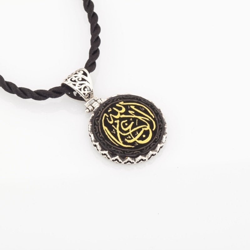 Oniks taşı üzerine isim kazıma yaptığımız el işi gümüş kolye modelimiz.