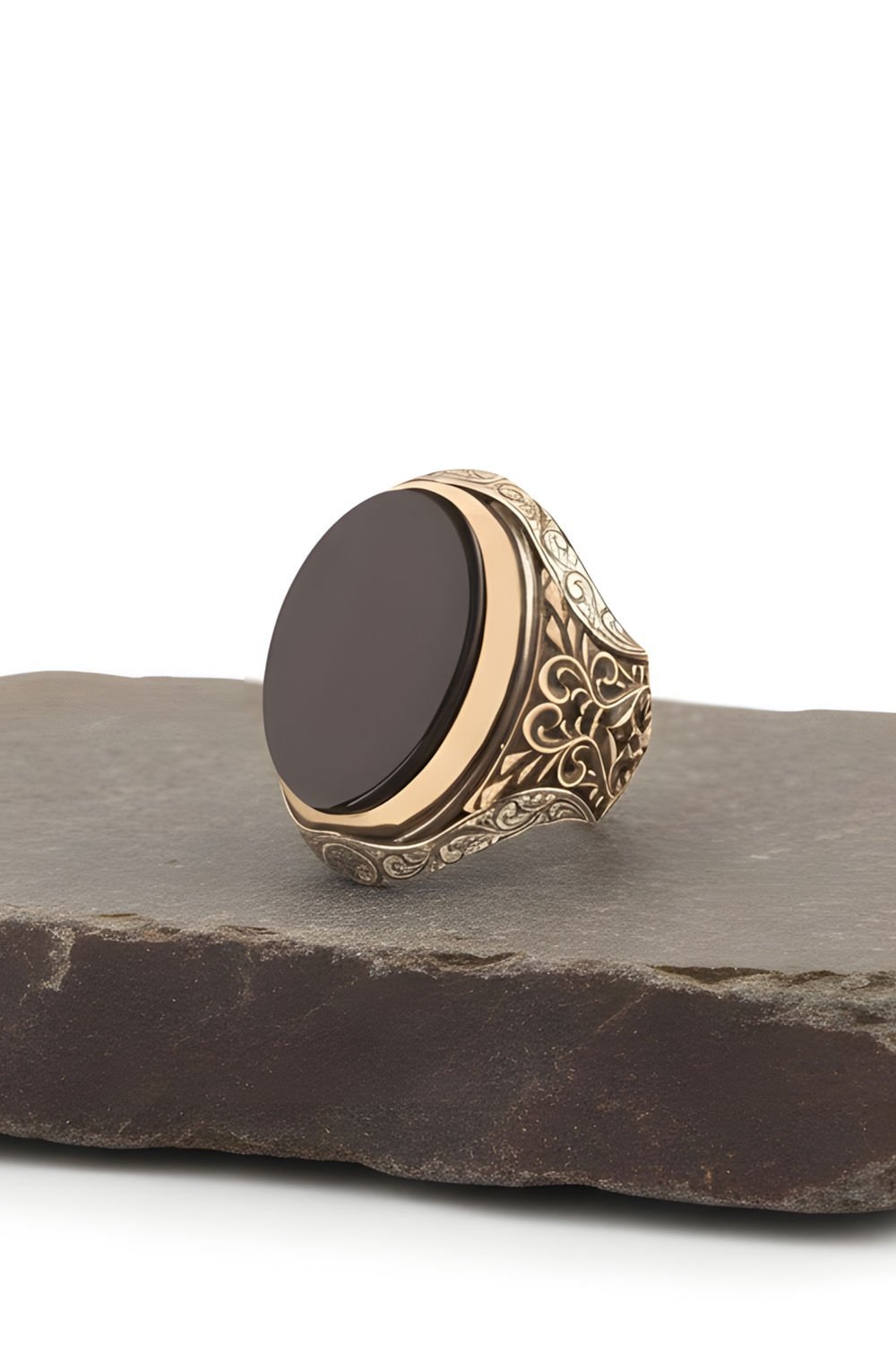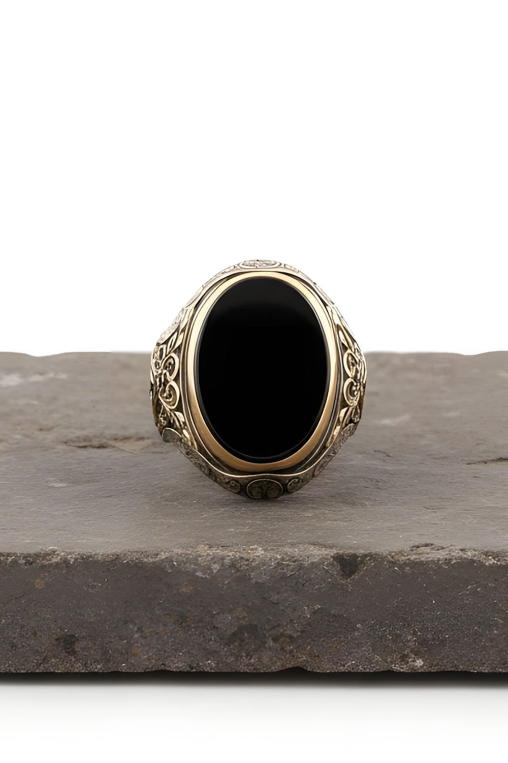 Yüzüğün merkezinde yer alan oniks taşı, doğanın gücünü ve zarafetini temsil eder. Taşın siyah tonları, gücü ve zerafeti bir araya getirir, her yüzüğe doğal bir çekicilik katar.