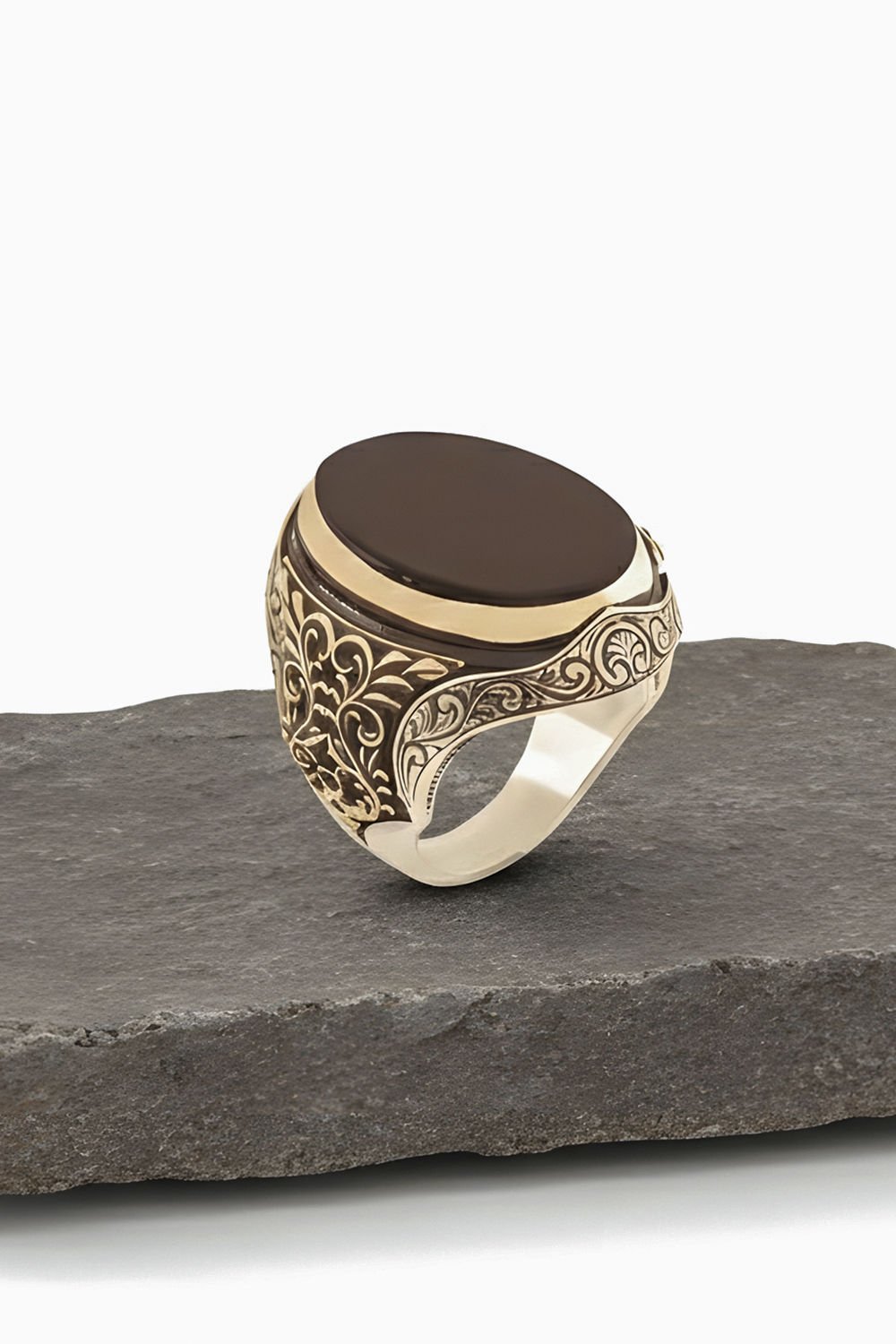 Bu özel erkek yüzüğü, doğal oniks taşı ve 925 ayar gümüş ile el işçiliğiyle üretilmiştir. Oval şekli ve özel işçilik detaylarıyla dikkat çeker.