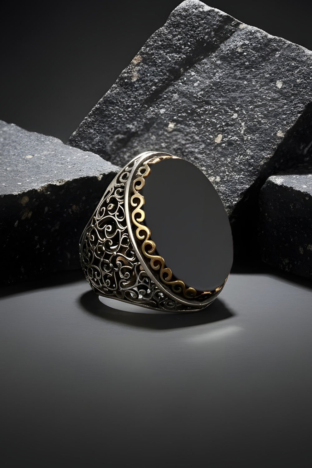 Oniks Taşlı Büyük Boy Sarmaşık Model Gümüş Yüzük |