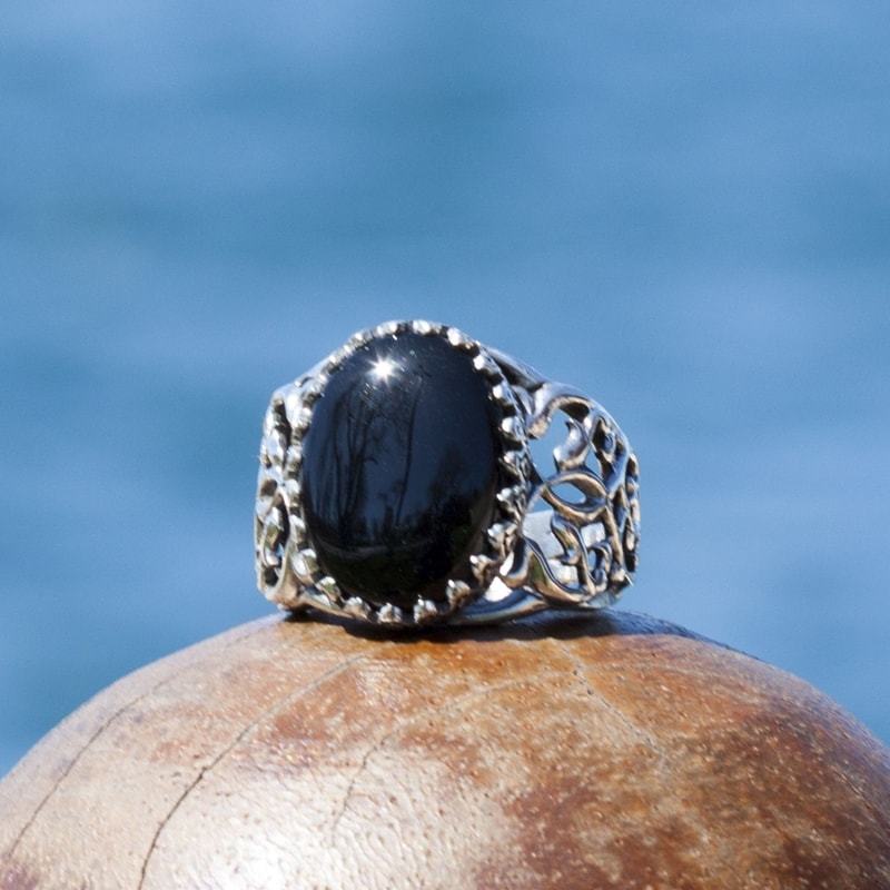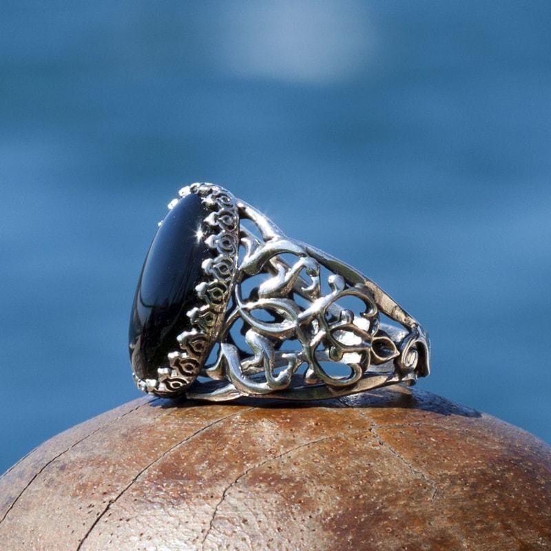 Orijinal oniks taşı, güç ve koruma simgesi olarak bilinirken, gümüş yüzük çerçevesiyle birleştiğinde zarif bir kontrast oluşturuyor. El işçiliği detayları, her bir yüzüğün özenle tasarlandığını ve üretildiğini gösterir. Özel işçilik, bu yüzüğü diğerlerinden ayıran özellikler arasında yer alıyor.
