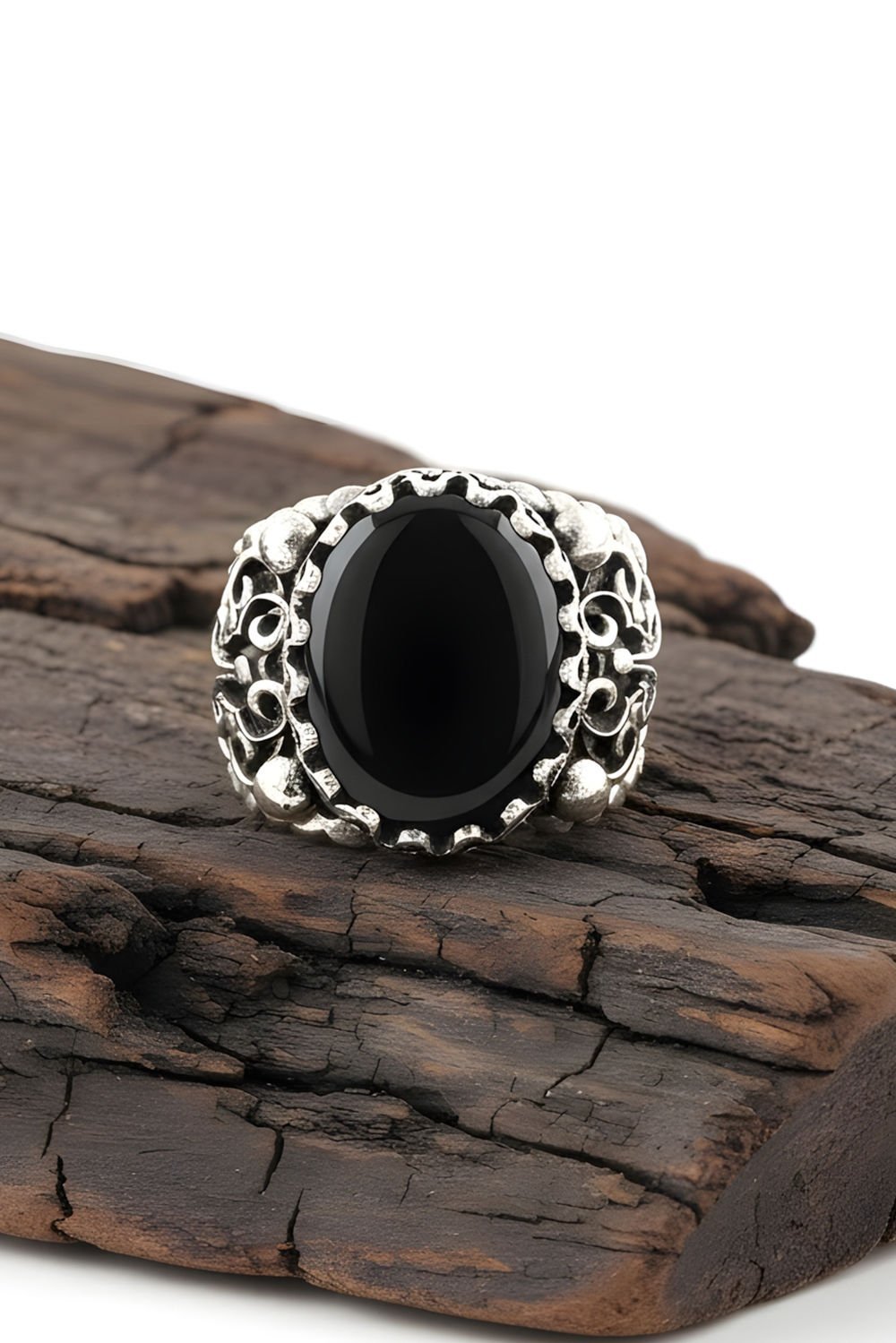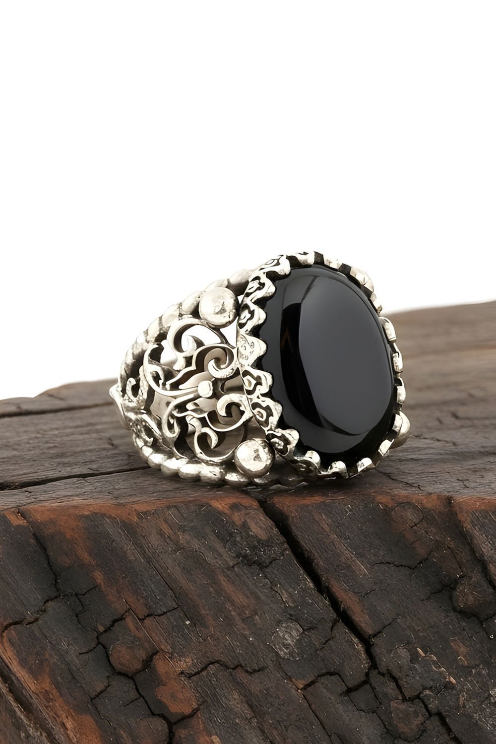 Doğal Oniks Taşlı Usta İşçilik Gümüş Erkek Yüzük