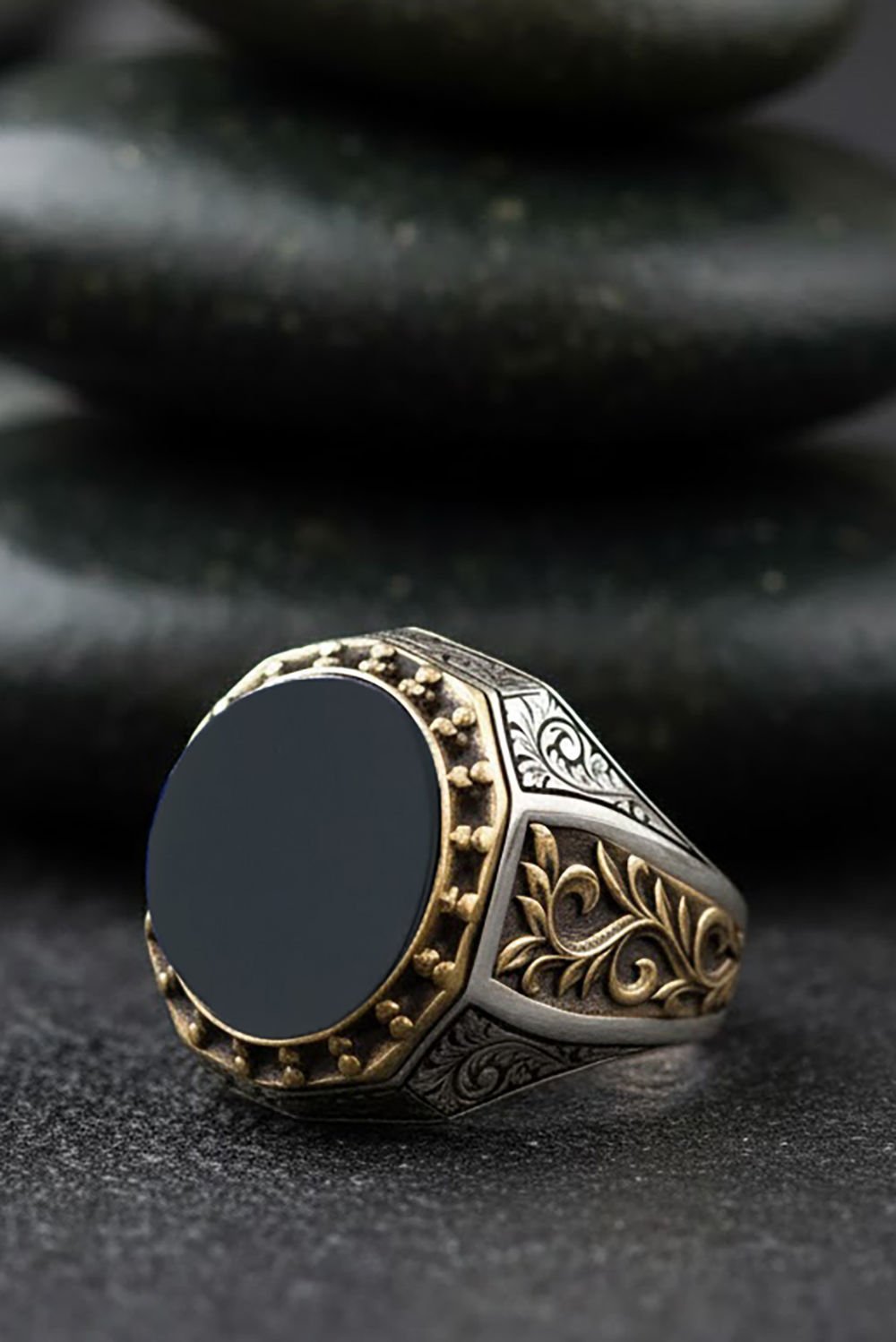 Oniks Taşlı Gravür Sarmaşık Model Gümüş Yüzük |