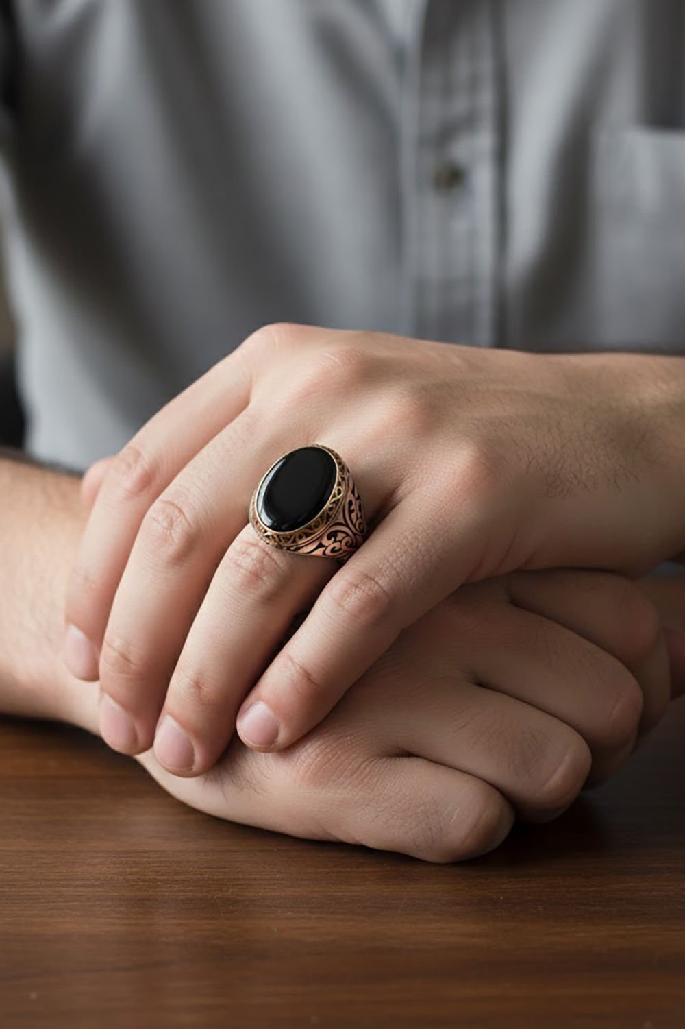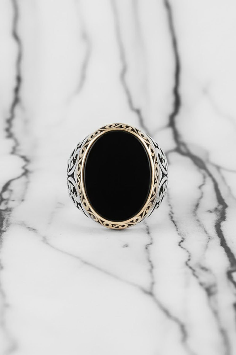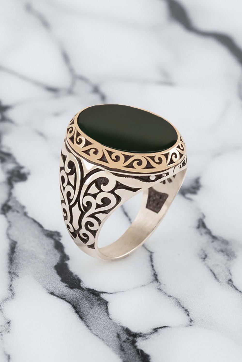 Hakiki ve orijinal doğal taşlar kullandığımız yüzüklerin bu modelinde Oniks taşını kullanıyoruz.