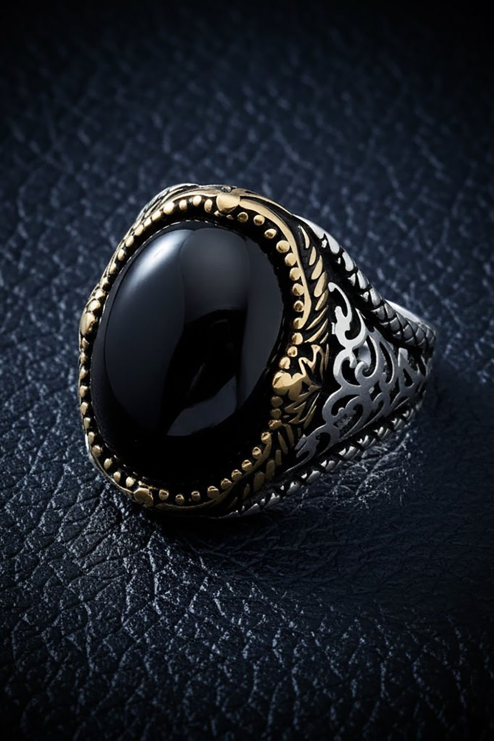 Yüzüğün merkezindeki doğal oniks taşı, güç ve kararlılığı simgeler. 925 ayar gümüşle birleştiğinde ise estetik ve zarafetin mükemmel bir uyumunu sunar.
