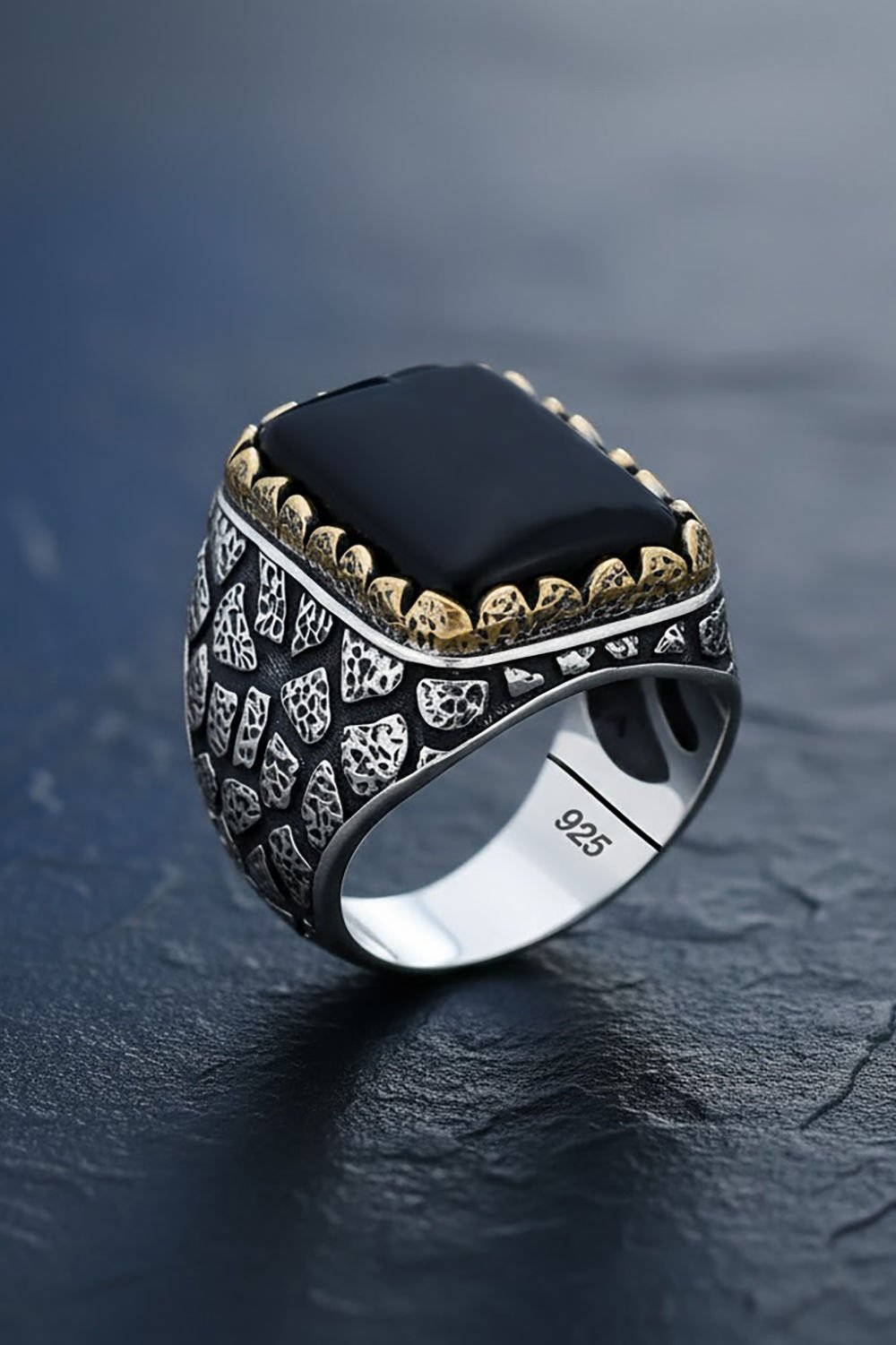 Bu özel erkek yüzük, doğal oniks taşı ve el işçiliği ile 925 ayar gümüşten üretilmiştir. Her detayı özenle işlenmiş olan bu yüzük, zarafet ve şıklığı bir araya getirir.