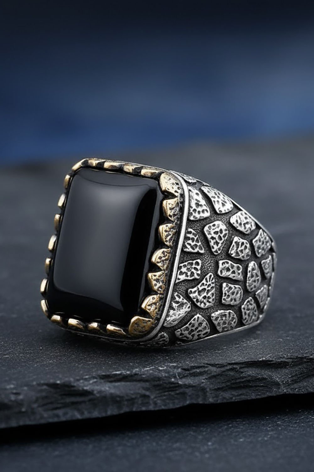Yüzüğün merkezindeki doğal oniks taşı, derin siyah tonları ve benzersiz deseniyle dikkat çeker. 925 ayar gümüş malzemeyle mükemmel bir uyum içinde olan bu taş, yüzüğe karakteristik bir görünüm kazandırır.
