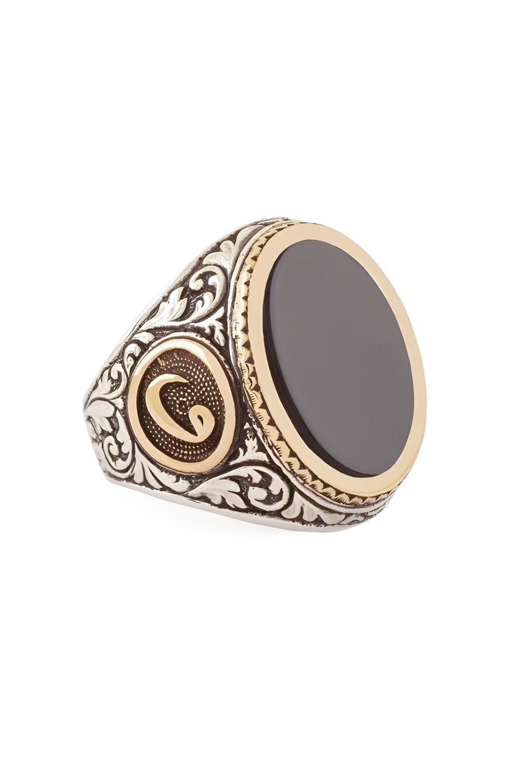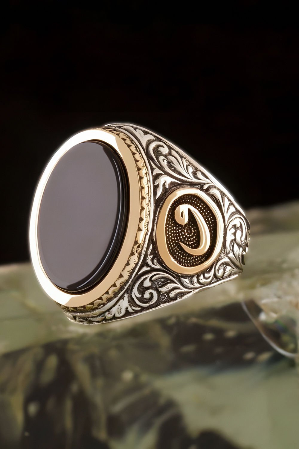 Oniks Taşlı Vav Desenli Gümüş Yüzük |