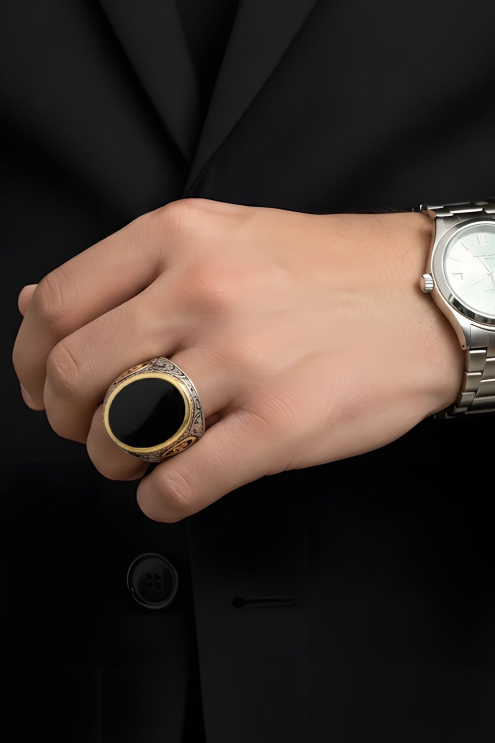 Oniks Taşlı Vav Elif Desenli Gümüş Yüzük