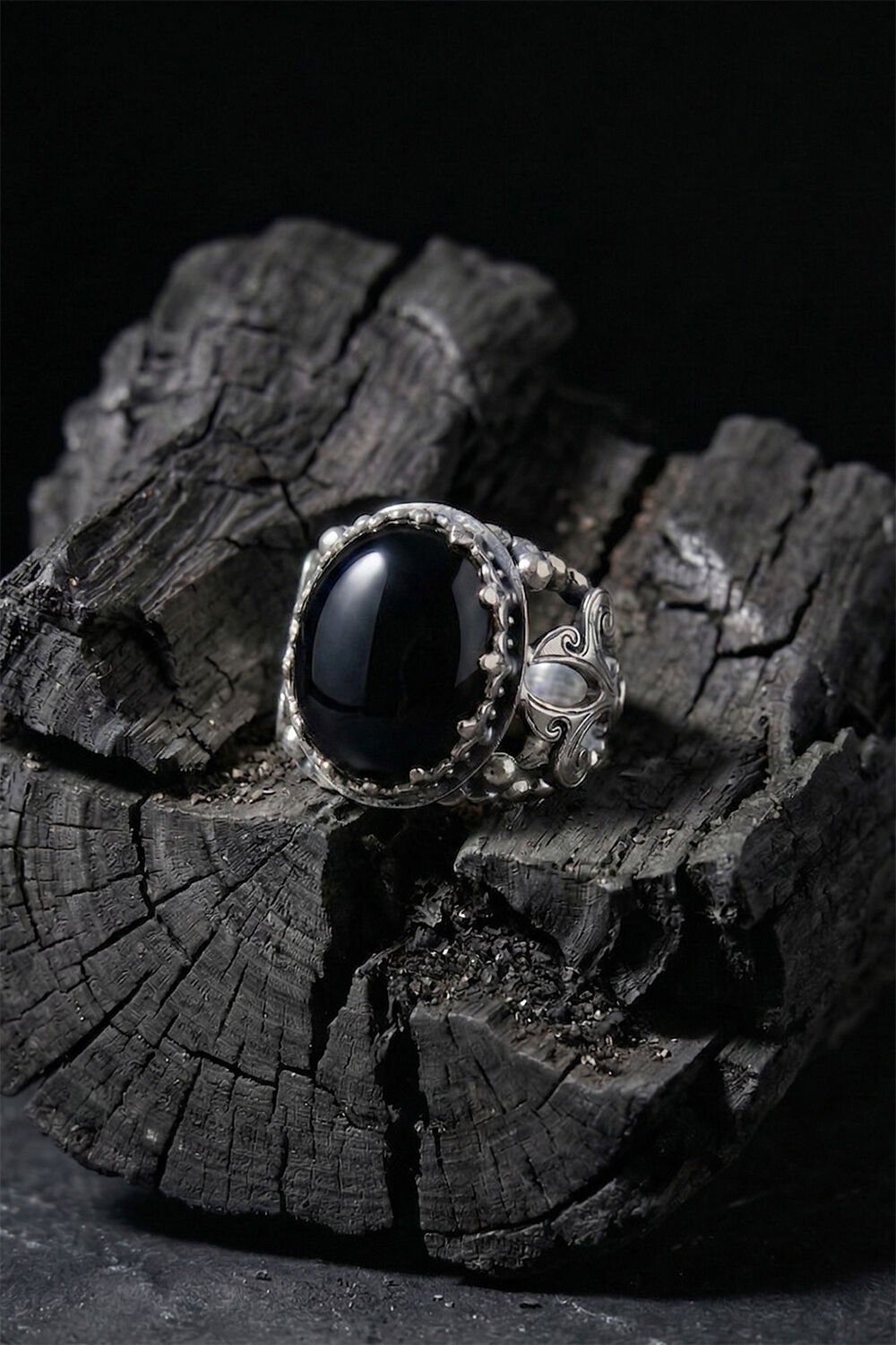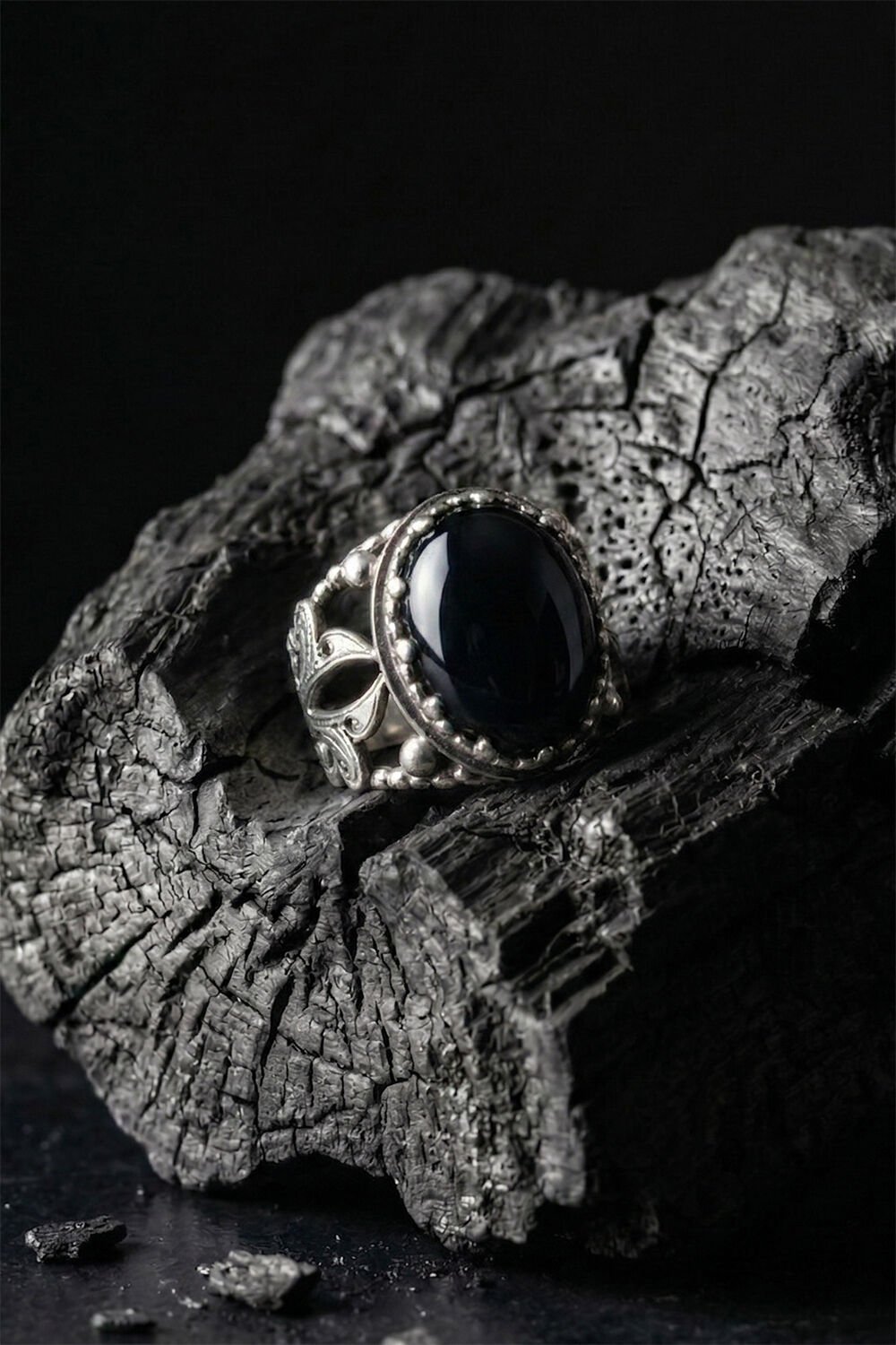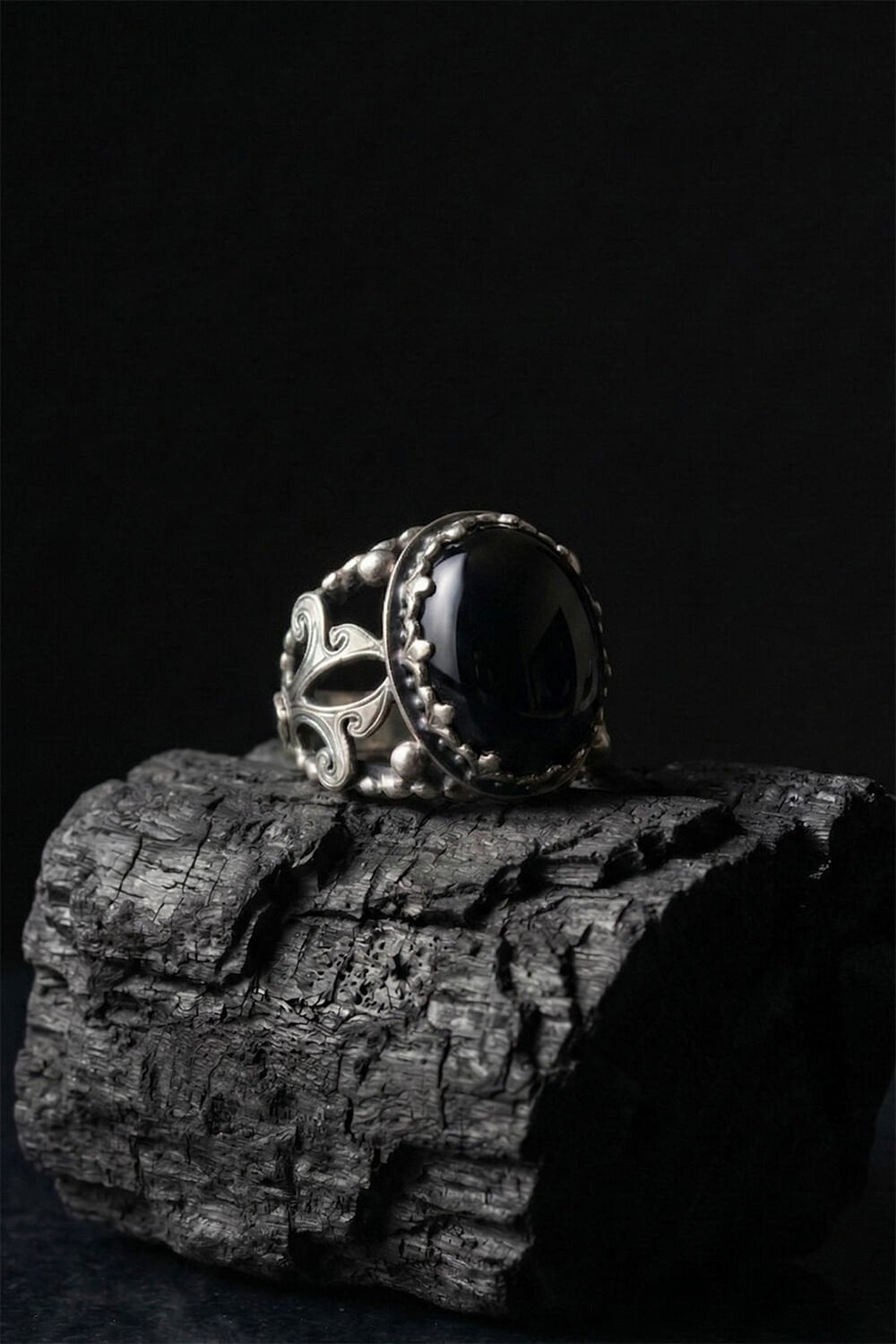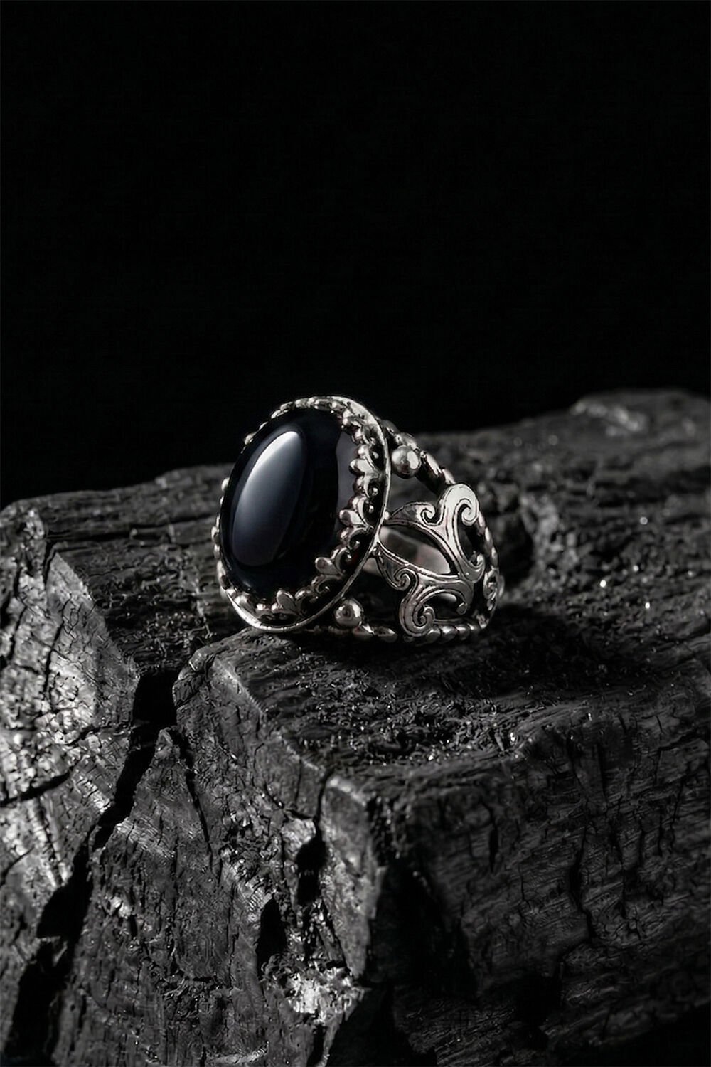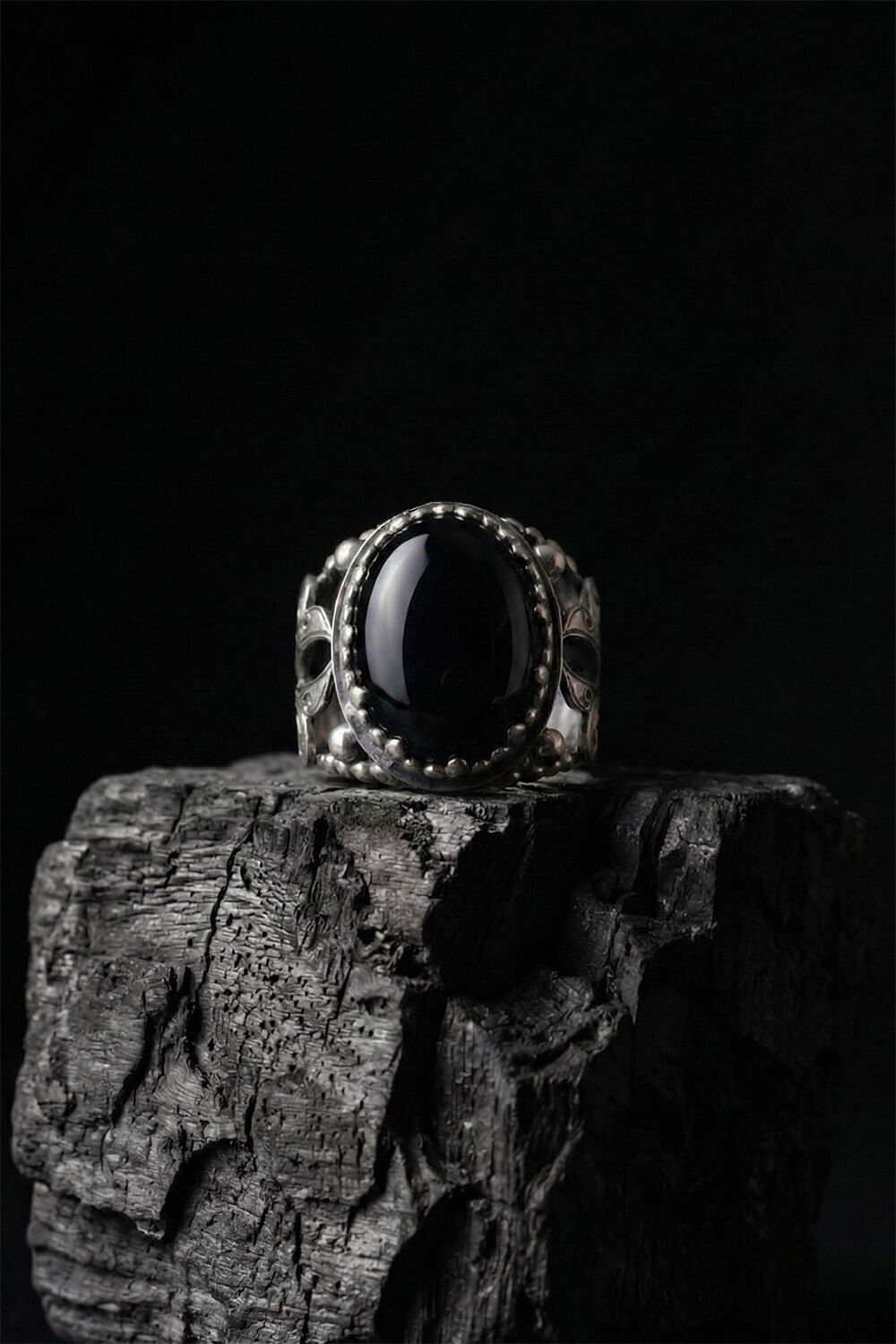 Yüzüğün merkezinde yer alan 15 x 20 mm ölçülerindeki fasetli oniks taşı, derin siyah rengiyle sadece şıklık sunmakla kalmıyor, aynı zamanda özgüven ve dengeyi temsil ediyor. Tamamen el işçiliği ile üretilen bu model, seri üretim ürünlerin aksine kendine has bir ruha ve karaktere sahiptir.