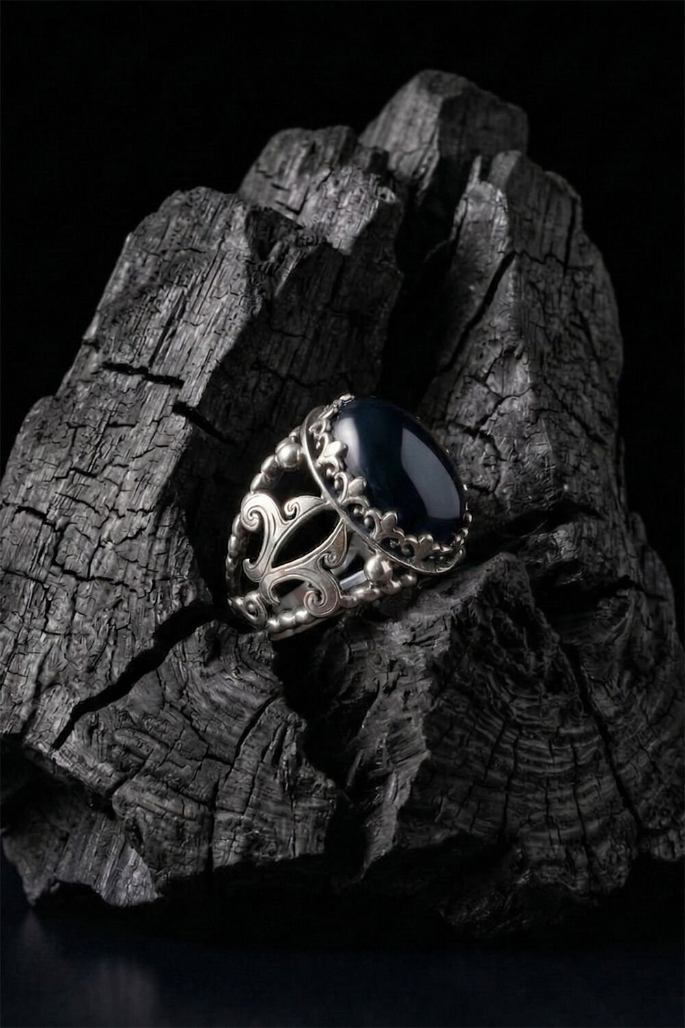 Oniks Taşlı Zambak Desenli 925 Ayar El İşçiliği Gümüş Erkek Yüzük