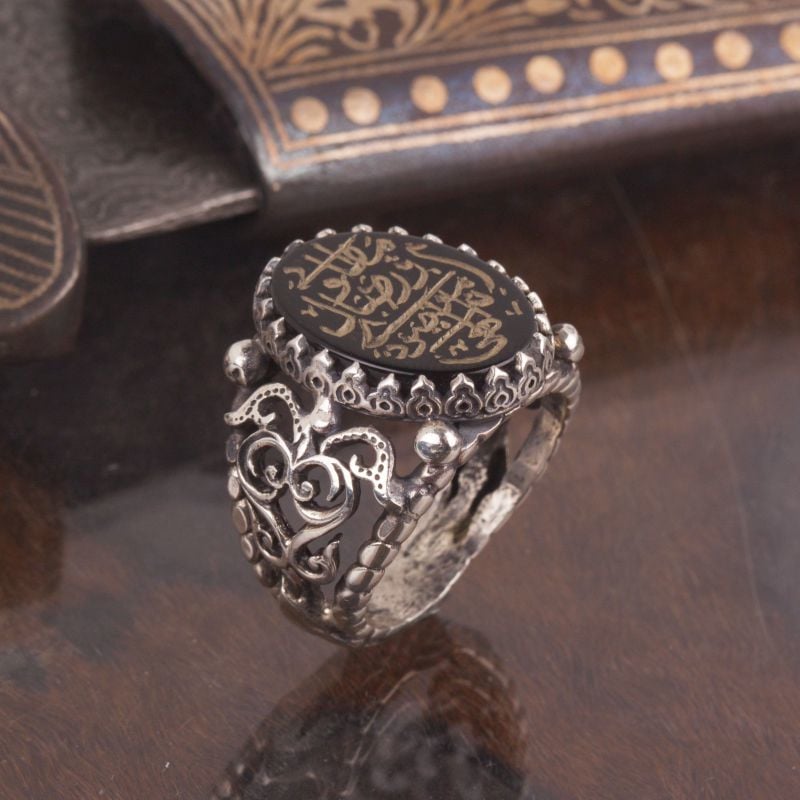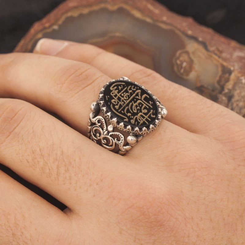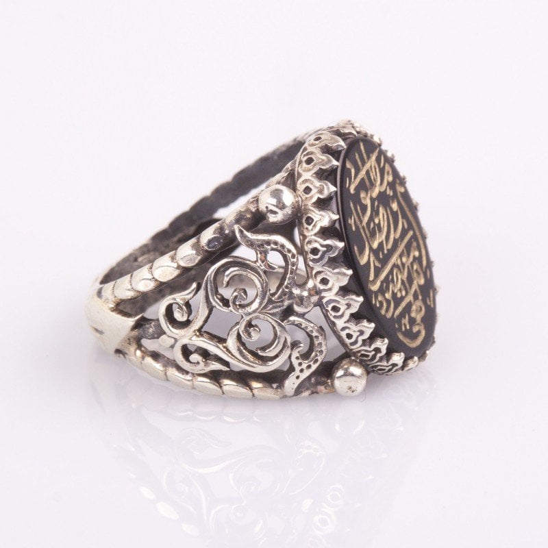 Her bir detayı özenle tasarlanmış olan bu yüzük, zarafet ve güzellik arayanların favorisi olmaya adaydır. Orijinal oniks taşının derinliği ve parlaklığı, bu yüzüğü özel kılan unsurlardır. "İlahi Ente Maksudi" yazısı ise kişisel bir anlam ve ifade katmaktadır.