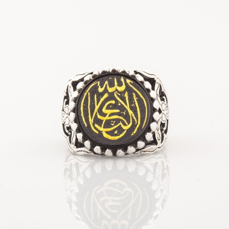 Doğal Oniks Taşlı El İşçiliği 925 Ayar Gümüş Yüzük Özel İşçilik "La Galiba Illallah" Yazısı Kazıma ile güçlü ve zarif bir ifadeye sahip olun. Bu benzersiz mücevher, anlamı ve estetiği bir araya getirerek sizi etkileyecek.