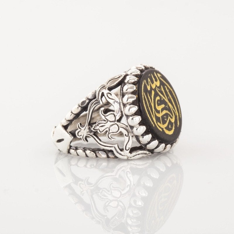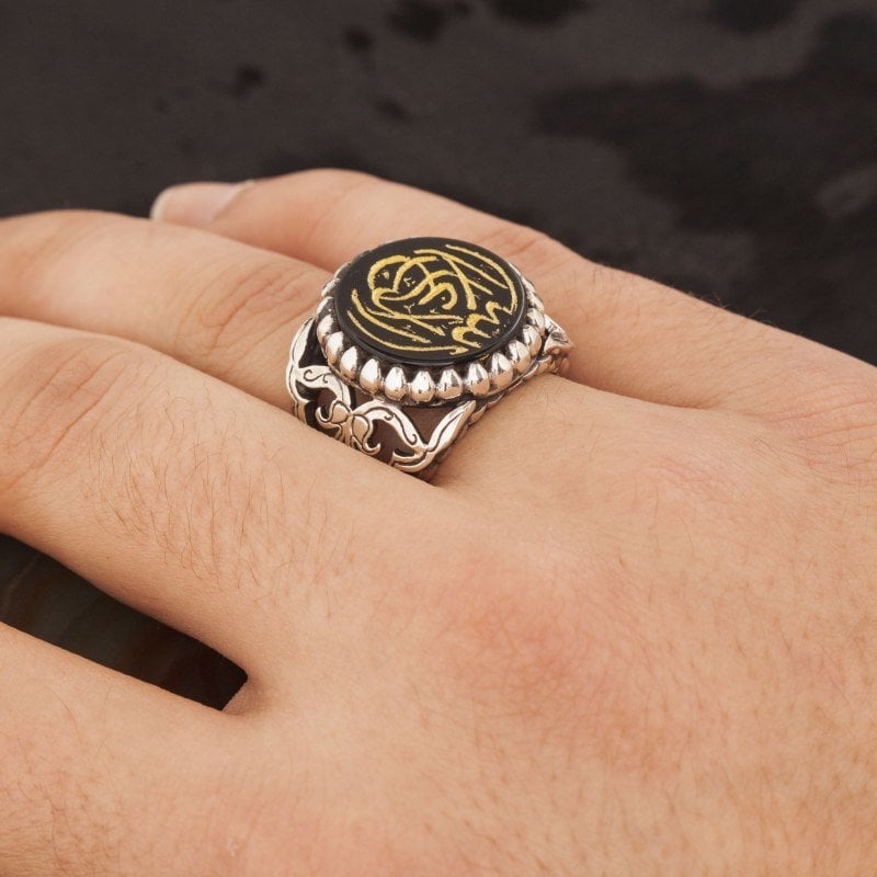 Oniks Üzeri La Galibe İllallah Kazıma El İşi Yüzük