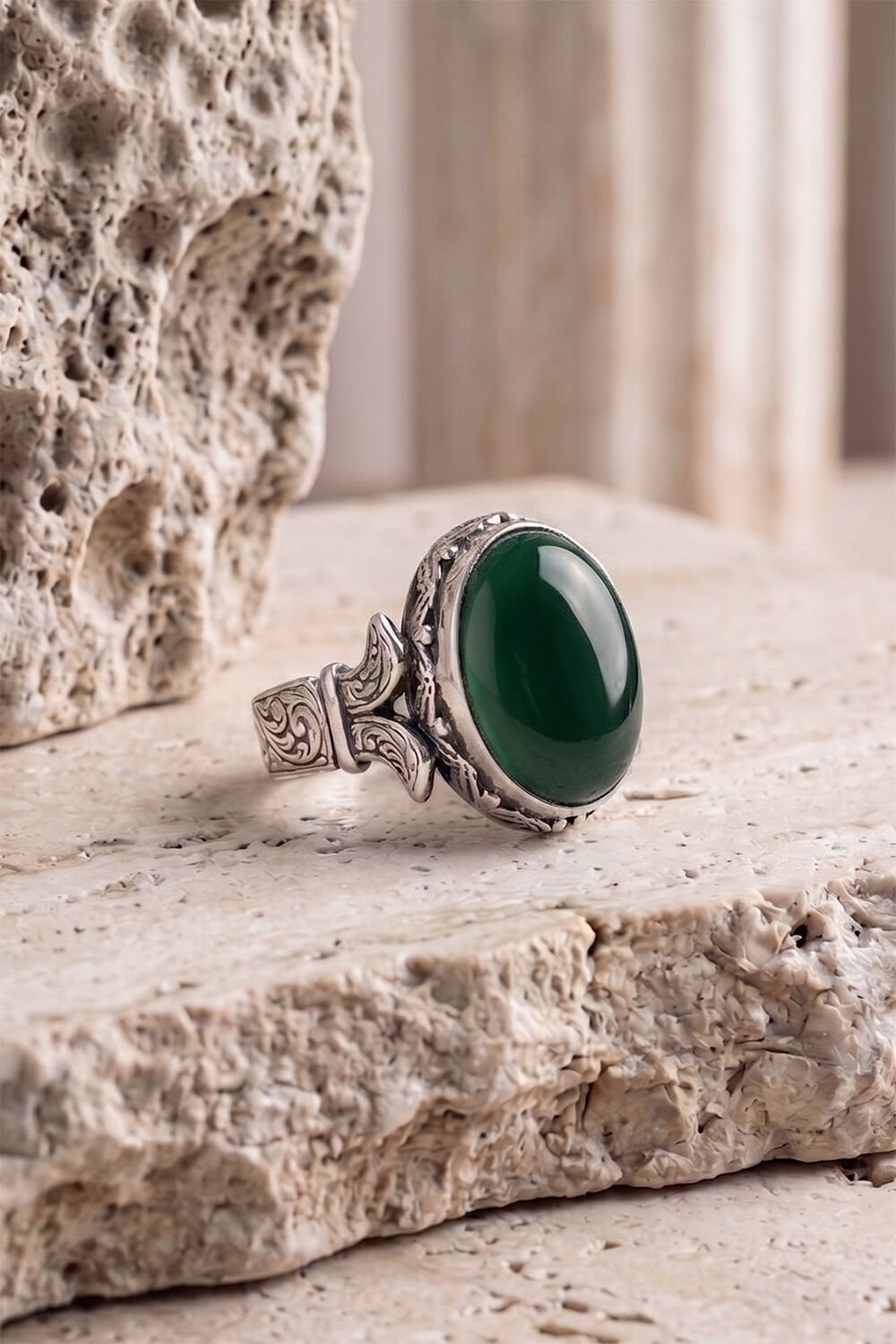 925 ayar gümüşün kalitesini, 13x18 mm boyutundaki göz alıcı oval yeşil akik taşıyla taçlandırdık. Yüzüğün yan kısımlarında yer alan ince kalem işçiliği ve "katre" (damla) formundaki detaylar, bu parçayı sıradan bir aksesuar olmaktan çıkarıp bir sanat eserine dönüştürüyor.