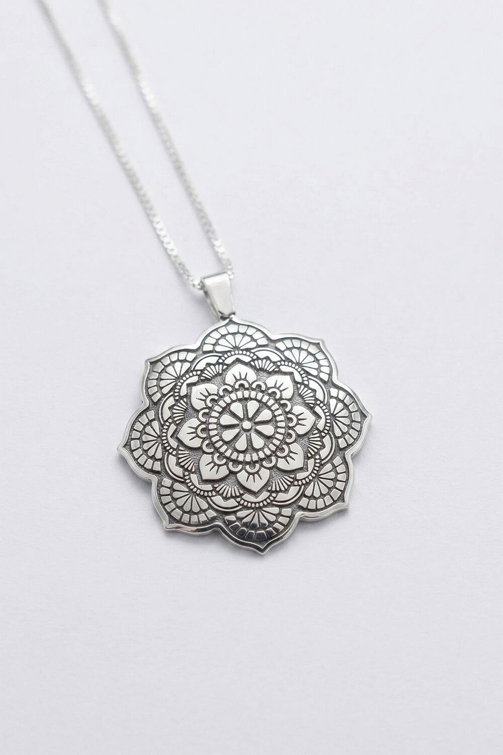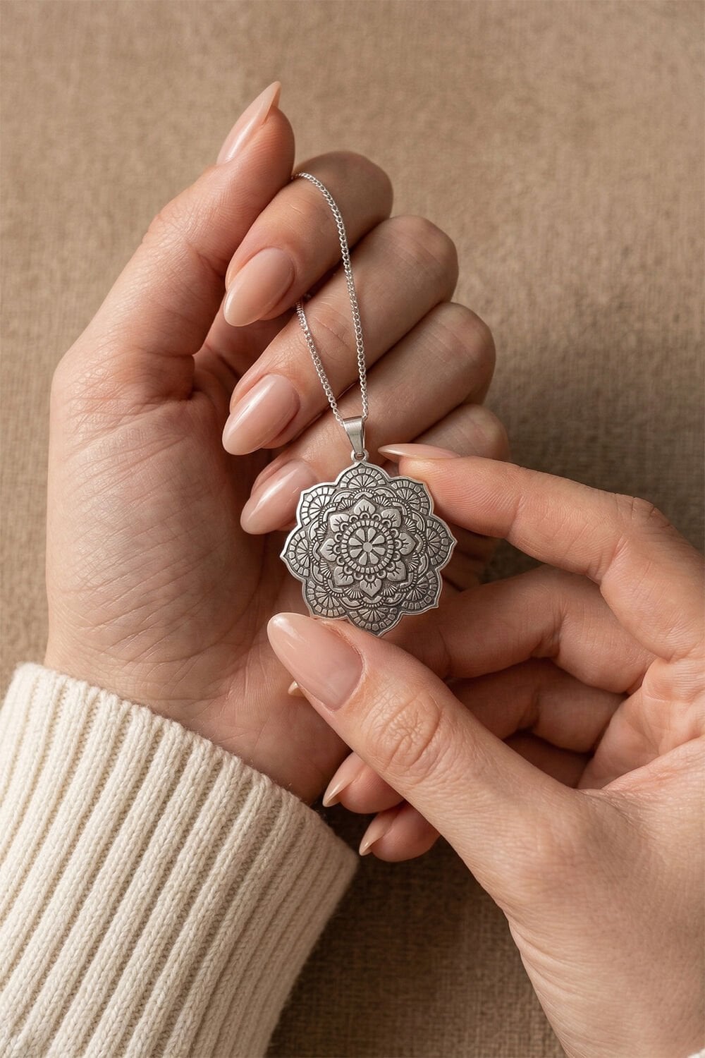 Günlük kombinlerinizde bohem bir hava yaratmak ya da özel davetlerde şıklığınızı özgün bir detayla tamamlamak için ideal olan bu kolye, gümüşün zamansız ışıltısını mandala deseninin simetrik estetiğiyle birleştiriyor.