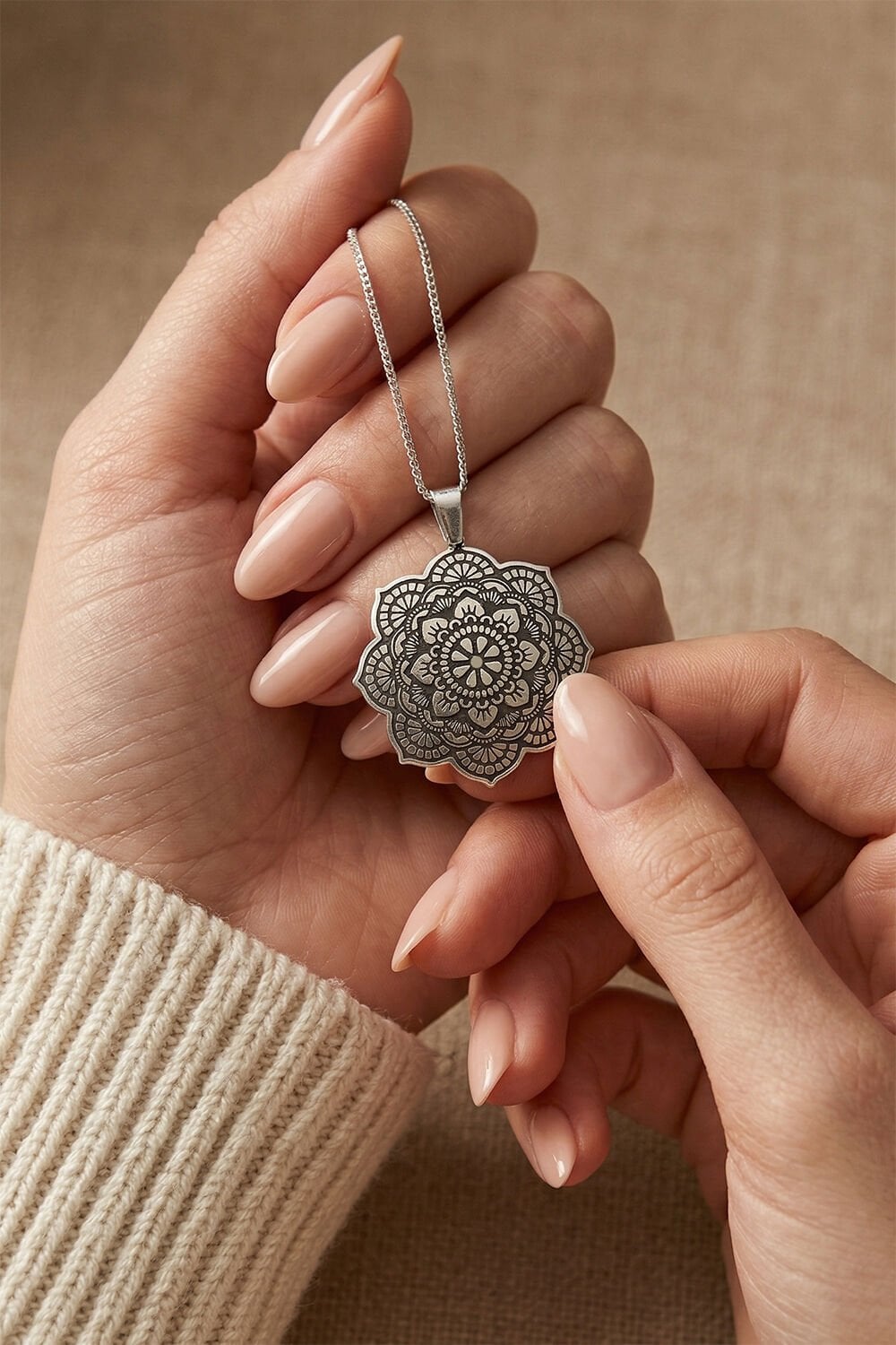 925 Ayar Gümüş Özel Tasarım Mandala Motifli Kadın Kolye – Şıklık ve Anlam Bir Arada